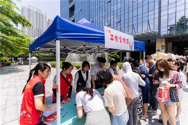 为更深入地了解园区职工的需求和意见,在工会宣传区,工作人员正在引导职工们填写职工需求调查问卷,并向职工们宣传工会职能和服务,关心职工生活,帮助职工解决生活、工作中的困难。