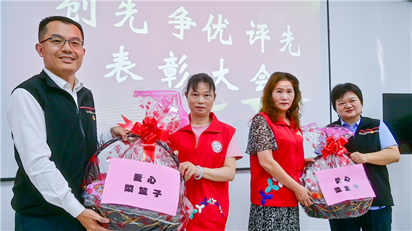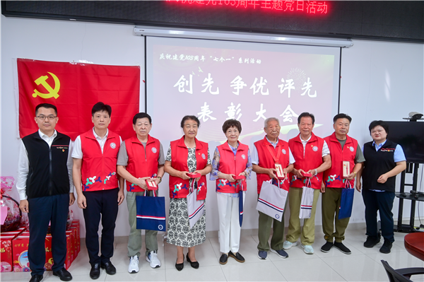 东晓街道党工委副书记金燕森、深圳市应急管理监测预警指挥中心党支部副书记张活良为有50年及以上党龄的老党员们颁发纪念品,并表彰优秀共建单位及个人,颁发“优秀应急先锋奖”“扶贫爱心企业奖”和“优秀综合网格员”。