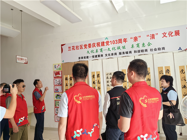 此前,兰花社区党委还开展了以“先锋面貌·聚力‘心’共创”为主题的庆祝建党103周年“亲”“清”文化展,通过创作“廉洁文化”主题的手工艺品,以及结合古诗词和新时代廉洁文化建设进行书法创作,组织农贸市场党支部、“两新”支部以及居民小区支部的党员们、居民群众和青少年儿童在书法作品中感受思想文化的力量,在画作中感悟廉洁寓意的深远。