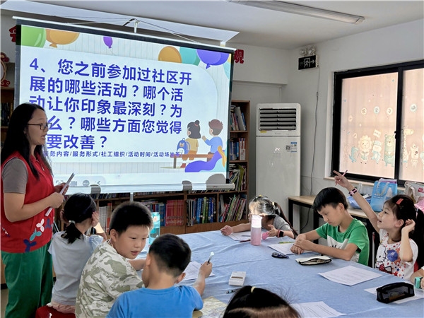 活动伊始,社区工作人员为孩子们介绍活动目的、意义及流程,通过破冰游戏增加组员间的了解和信任。随后,在调研环节,工作人员通过问答方式,引导孩子们分享自己的学习和生活爱好,以及在参与过往活动中的收获和感受。“你希望社区服务中心开展什么类型的活动”“希望能和爸爸妈妈一起参加活动”“我很喜欢做手工”“希望可以有更多运动类型的活动或比赛”“跳蚤市场很好玩也很有意义”“希望可以和小伙伴阅读书籍”......孩子们畅所欲言,和组员一起交流讨论,工作人员把孩子们的想法一一记录下来,并进一步了解他们对社区现有服务的知晓度、参与意愿、精神文化需求和建议意见等。