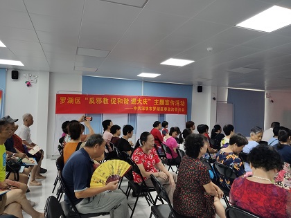 罗湖区家园网讯:进一步加大辖区反邪教宣传力度,绿景社区工作站2019年8月14日在党群服务中心开展反邪教宣传讲座,主题为“反邪教,促和谐,迎大庆”。