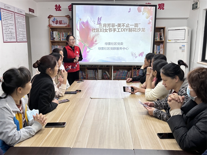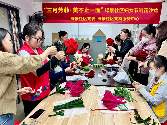 为进一步宣传关爱女性的重要理念,对社区女性提供节日关爱和祝福在绿景社区党委的带领下,绿景社区党群服务中心温馨社工于3月7日开展了“三月芳菲·美不止一面”绿景社区妇女节DIY制花沙龙,以手工制花为依托,通过鼓励引导、畅聊互动等方式帮助社区女性在手、脑、眼的协作中转移注意力、放松身心,提高社区女性对社区的归属感和幸福感。
