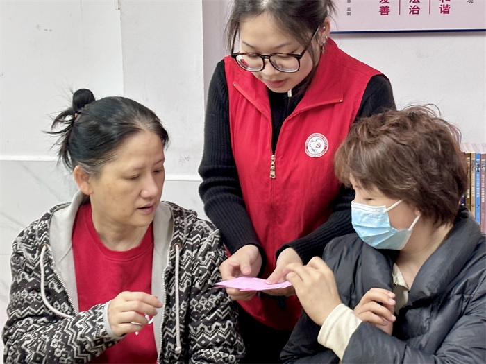 正向引导识自我,手写祝语暖人心:社工在活动介绍环节通过专业技巧,同理了女性参与者们在社会上、生理上处于一定弱势的情况以及日常忙碌于工作和照顾家庭的辛劳,以手工花种类弗洛伊德为引子,介绍了精神分析领域极具影响力的弗洛伊德人本结构理论中“自我人格”力量的重要性,对参与者们进行正向引导,帮助女性认识到在受限的环境下保持自我、增强内心自我的力量以平衡人格的重要性。同时,社工分发了手写卡片由参与者随机抽取,祝语以引导女性活出自我、寻找内在力量为主题,鼓励女性在忙于生活的同时关注内心世界、爱护自我,敢于探索“我”、丰盈内在力量。