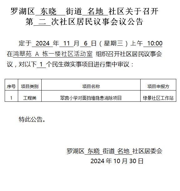 2024年东晓街道名地居委会关于召开第二次居民议事会议公告