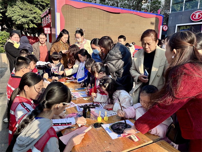 游园互动游戏区域更是热闹非凡,充满了欢声笑语。投壶纳福游戏处,居民们排起了长队,手持箭矢,全神贯注地将箭投入壶中,每一次投中都伴随着欢呼声和掌声,大家仿佛穿越回了古代,体验着古人的娱乐方式,感受着传统文化的魅力;帽糖嬉春游戏别具一格,参与者们头戴可爱的帽子,在规定的时间内吃糖,滑稽的模样引得周围的人哈哈大笑,整个游戏区域充满了轻松愉快的氛围;非遗拓印区域,大家纷纷围在桌前,在志愿者者的指导下,用毛笔小心翼翼地涂墨,将宣纸轻轻覆盖在年画模板上,一幅幅精美的拓印作品逐渐显现,居民们在体验中感受到了非遗文化的独特魅力;毛笔书签环节更是吸引了众多书法爱好者们和小朋友们的参与,大家拿起毛笔,蘸上墨汁,在书签上一笔一划地书写着自己的新春祝福和美好心愿,现场弥漫着淡淡的墨香,居民们跃跃欲试,尽情地体验着毛笔书法的乐趣;福罐掷宝游戏也备受欢迎,参与者们滚动罐子,期待着罐子停留的位置能为自己带来好运和奖品,每一次滚动都牵动着大家的心弦,投中的居民兴高采烈地领取奖品,现场气氛热烈而有序。