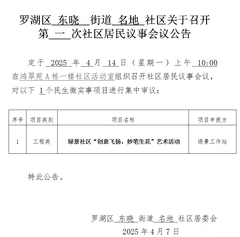 2025年东晓街道名地居委会关于召开第一次居民议事会议公告