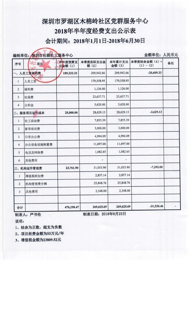 木棉岭社区党群服务中心2018年半年度经费支出公示
