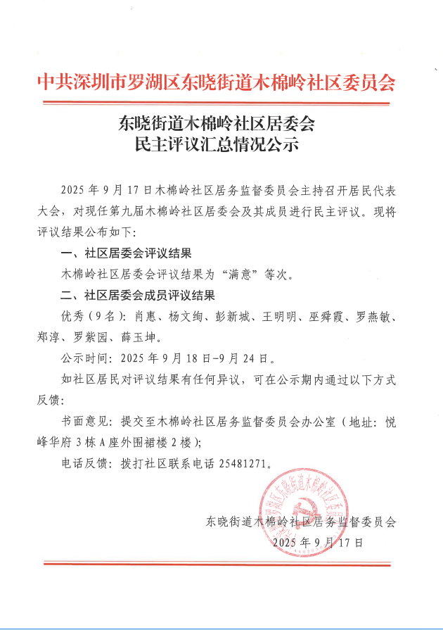 2025年9月17日木棉岭社区居务监督委员会主持召开居民代表大会,对现任第九届木棉岭社区居委会及其成员进行民主评议。现将评议结果公布如下: