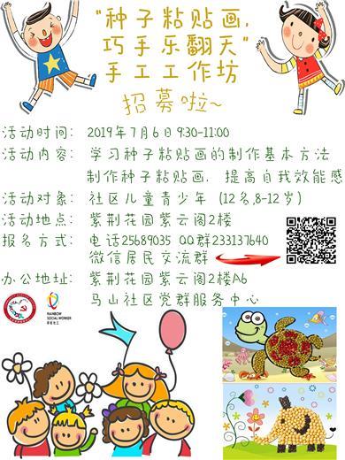 各位居民朋友们: 本中心预计于7月6日(周六上午9点半至11点)开展“种子粘贴画,巧手乐翻天”手工工作坊,地点位于紫荆花园二楼马山社区党群服务中心处,本次活动招募对象是12名8至12岁的社区儿童青少年,此次活动报名会进行筛选,在筛选完后会在活动开始之前公布名单,欢迎感兴趣的居民前来报名。