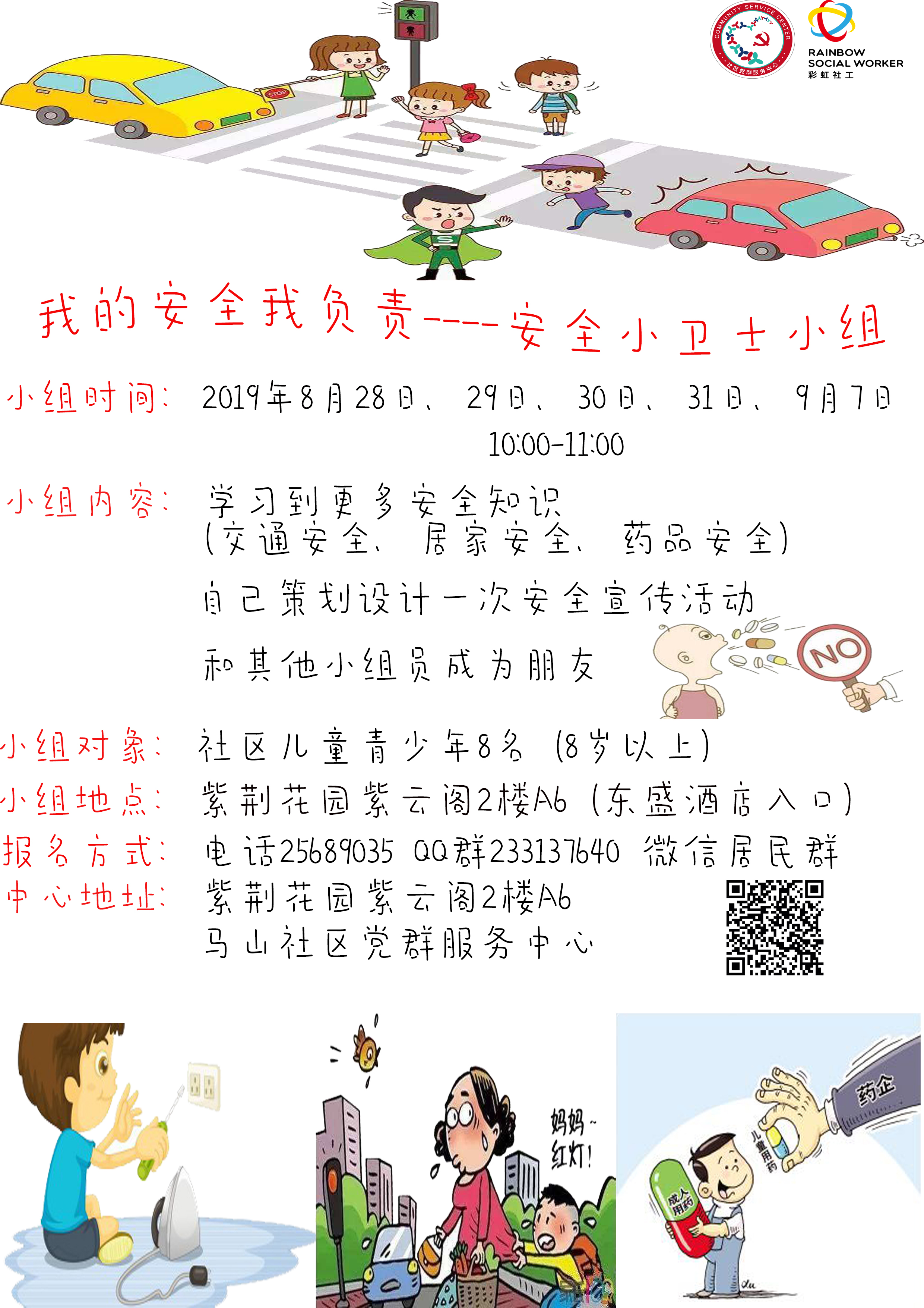 本中心预计开展青少年领域小组“我的安全我负责--安全小卫士小组”,时间分别暂定在8月28日、29日、30日、31日、9月7日10:00-11:00,此次小组活动的是连续开五节的,请居民安排好时间在确定报名。此次小组内容主要让小朋友们学习到更多的安全知识(交通安全、居家安全、药品安全)以及让小朋友自己策划设计一次安全宣传活动。本次小组地址在东盛酒店二楼处,欢迎感兴趣的社区青少年前来报名!详情见海报。