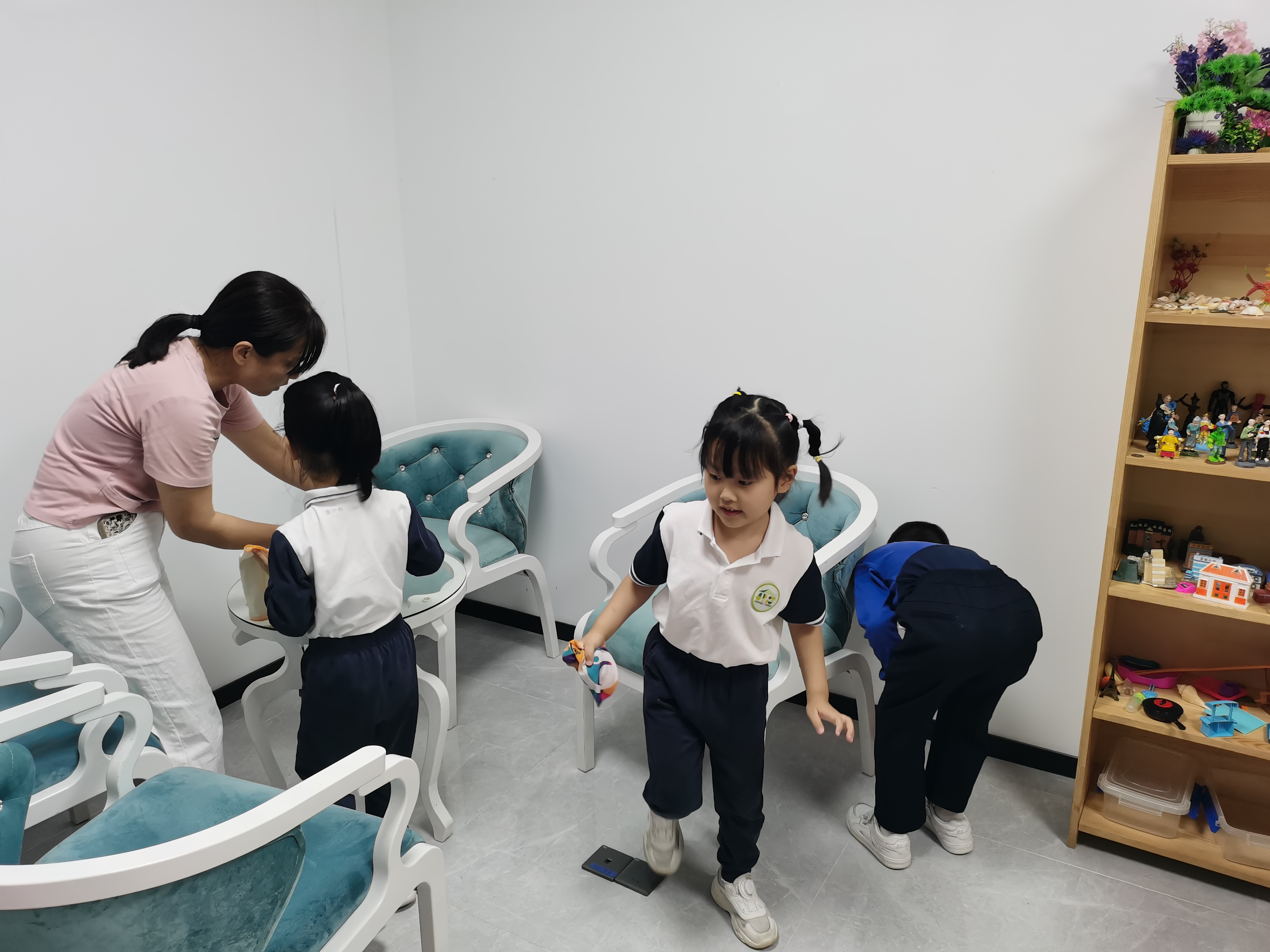 在心理服务室,孩子们踮起脚尖整理沙盘玩具,用彩色便签为玩具柜贴上分类标签;图书室里,“小书虫”们捧着比自己还高的绘本,在党员老师指导下按“绘本区”、“科普区”仔细归类,时不时凑在一起讨论“这本书应该放在哪里呀”;活动室中,孩子们两两合作擦拭桌椅,有的蹲着清理角落灰尘,有的举着抹布踮脚擦窗台,汗水沾湿了刘海,却始终挂着开心的笑容。