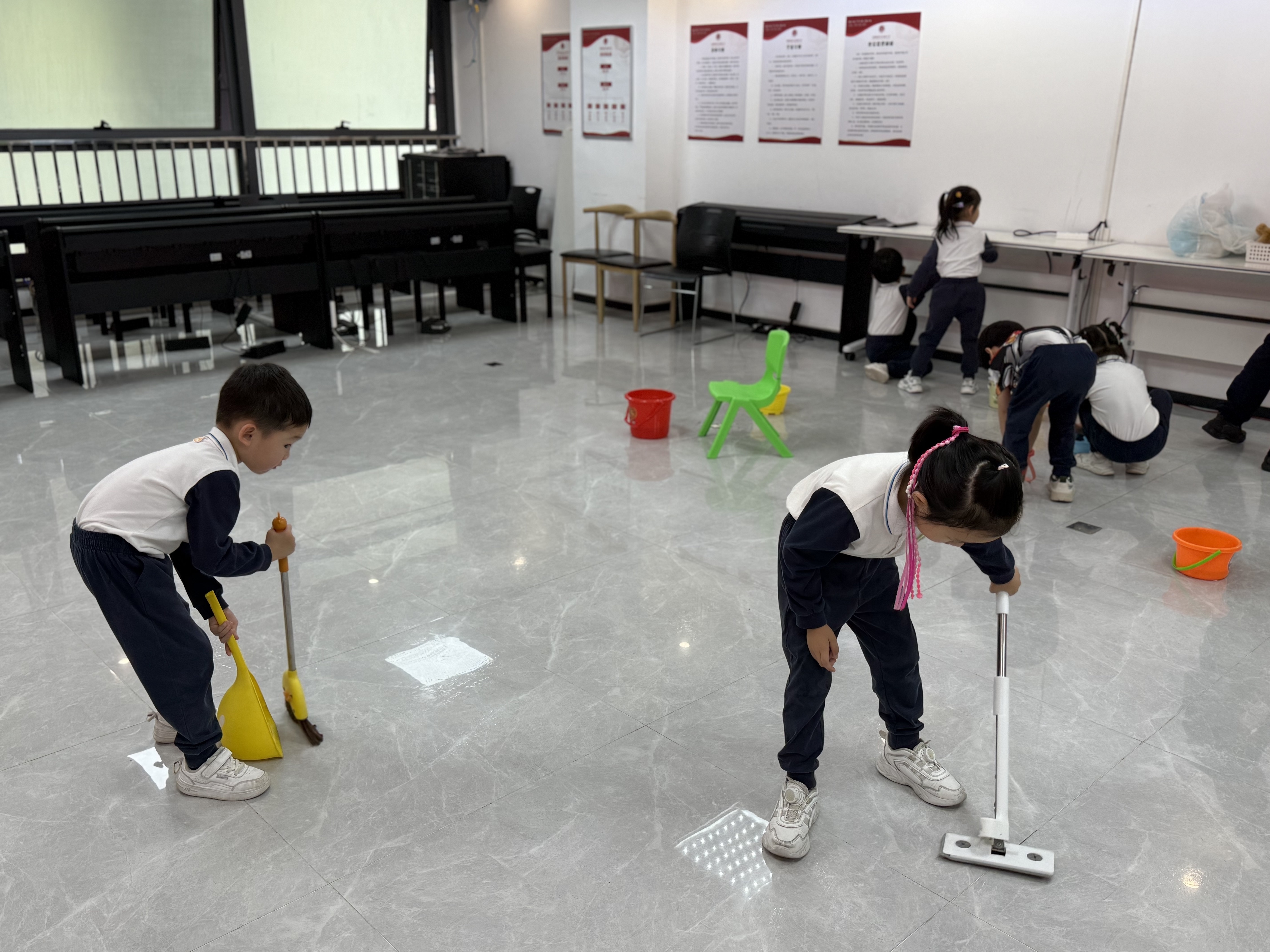 随后,孩子们在党员教师的带领下分组领取任务卡:“心理服务室物品整理组”、“图书室图书归位组”、“活动室清洁组”,稚嫩的脸上写满认真,一场充满童趣的劳动实践正式拉开帷幕。