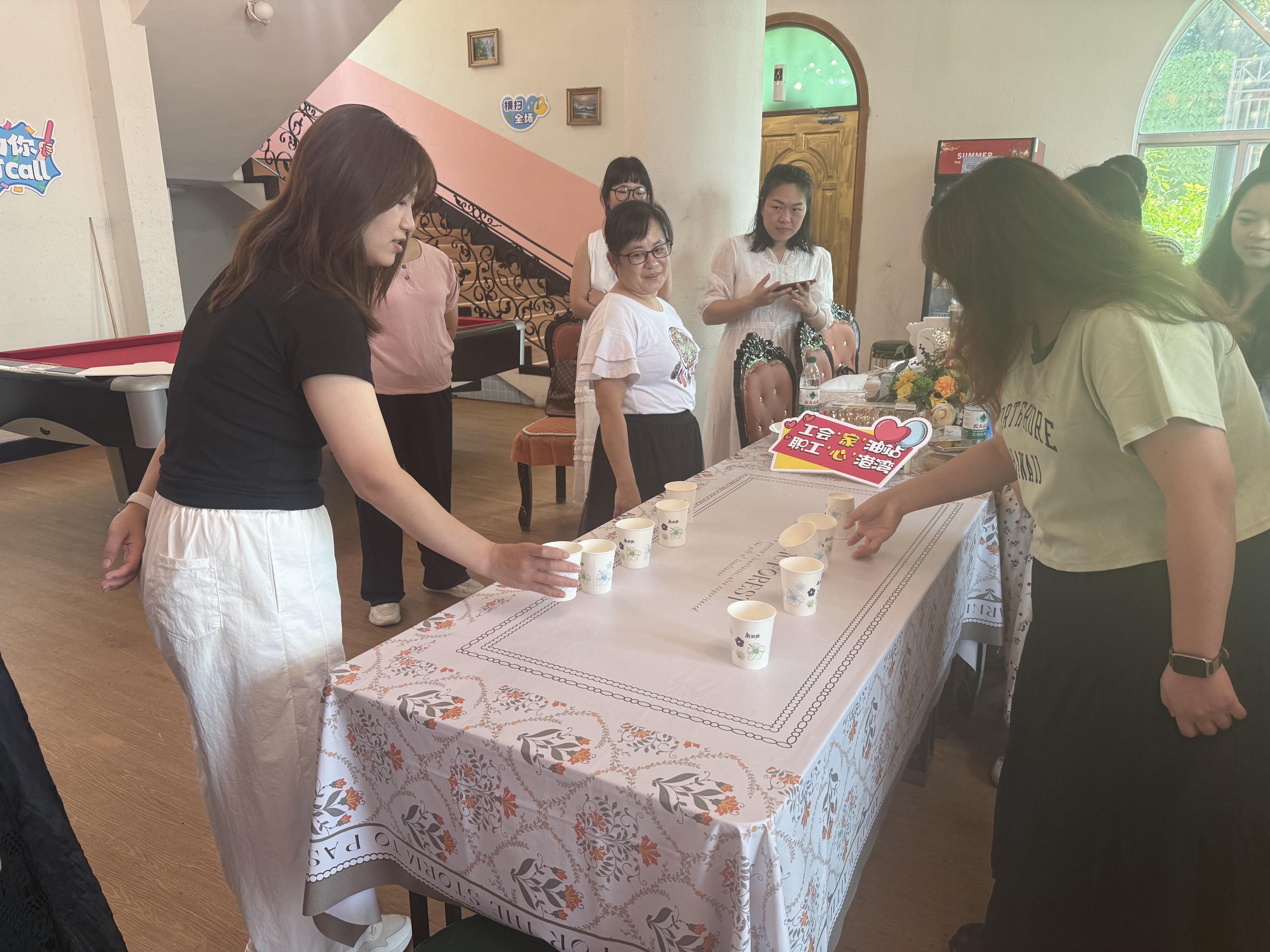 活动现场,26名职工通过随机分组,迅速组成两支队伍,以饱满的热情投入猜歌名、你划我猜、翻转水杯接力赛等精心设计的趣味项目中。猜歌名环节,经典旋律响起,职工们迅速调动音乐储备,争分夺秒抢答,现场气氛热烈;你划我猜考验团队默契,比画者生动形象的肢体语言与猜词者心领神会的应答,引得阵阵欢笑;翻转水杯接力赛则强调团队协作,队员们紧密配合、争分夺秒,将活动氛围推向高潮。在一系列活动中,职工们默契配合、互相鼓励,尽情释放工作压力,现场笑声不断。