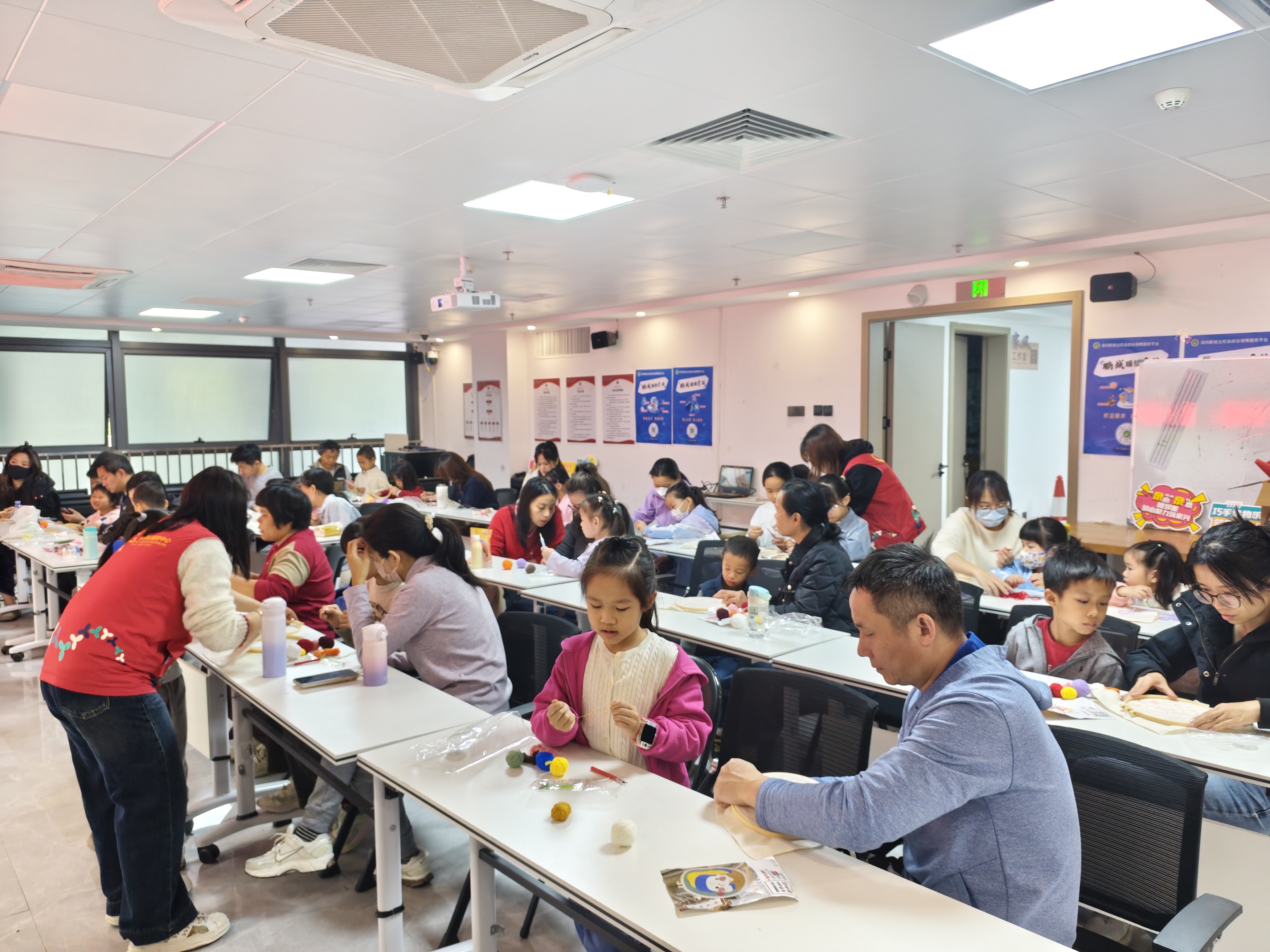 活动现场暖意融融,色彩斑斓的毛线团、造型各异的制作模板整齐摆放在桌上,社工提前做好场地布置和材料准备,为亲子家庭营造了温馨有序的创作环境。“先把毛线固定在模板上,像这样轻轻戳……”活动伊始,社工细致讲解戳戳绣的制作技巧,手把手指导家长和孩子掌握操作要领。孩子们听得聚精会神,家长们则耐心陪伴,有的家庭分工协作,爸爸扶着模板,妈妈和孩子共同进行戳制;有的家庭相互探讨,在尝试中寻找最佳方法,指尖的灵动穿梭间,一个个初具雏形的手工作品逐渐呈现,温情在亲子互动中静静流淌。