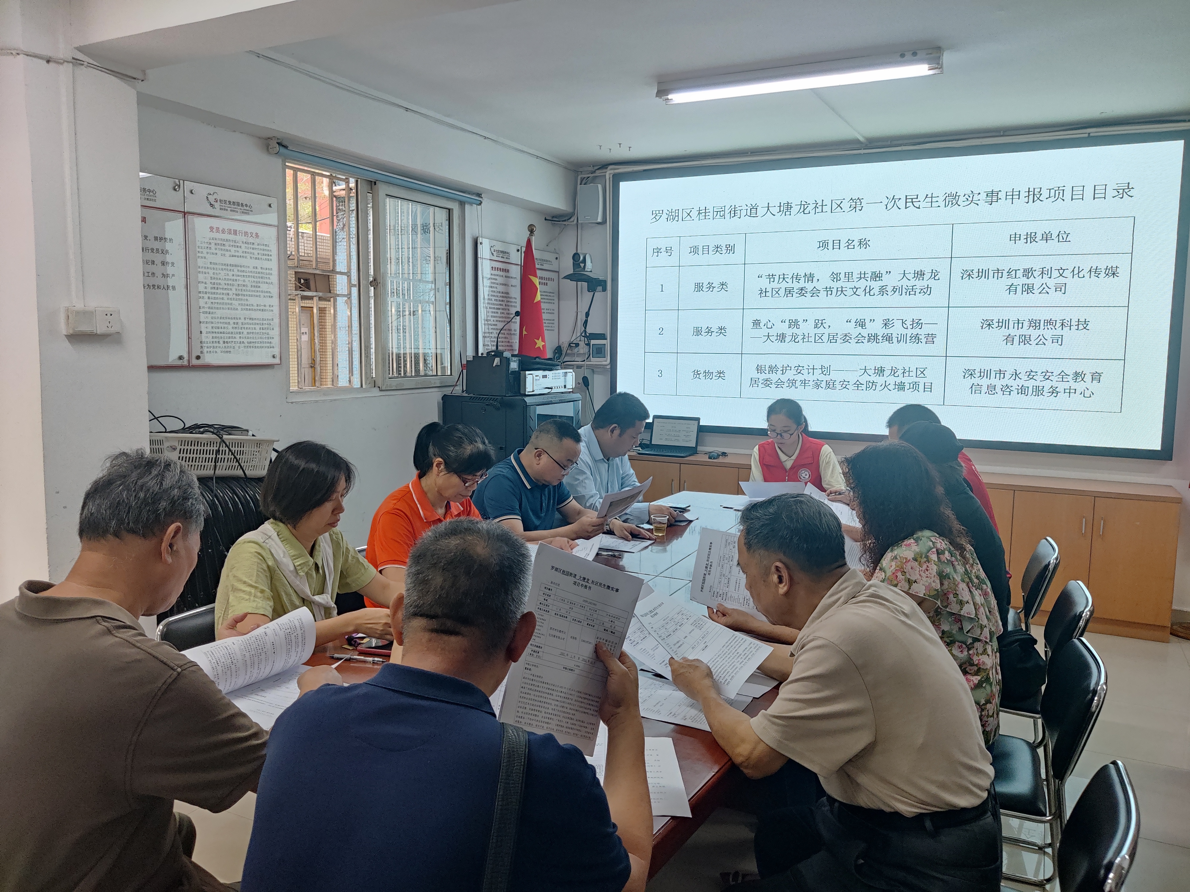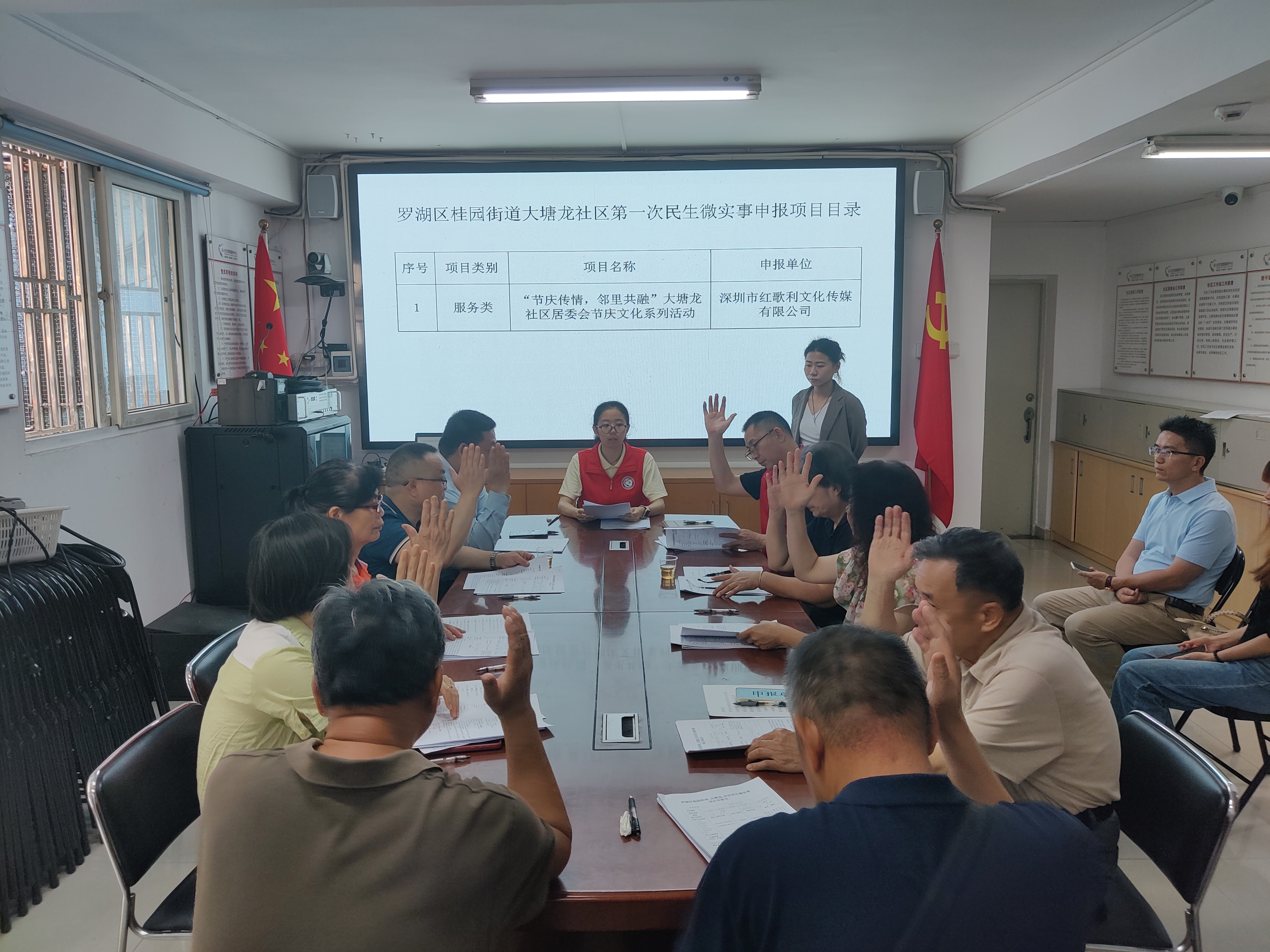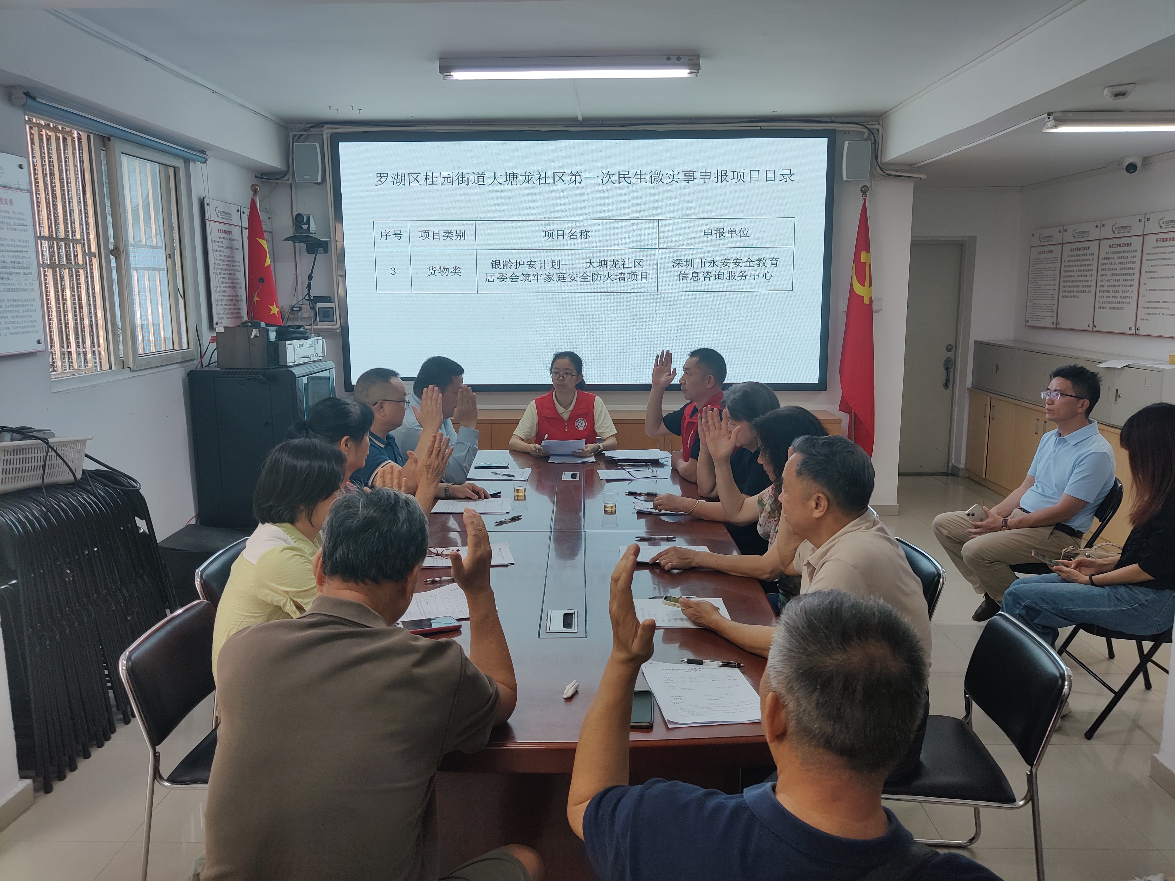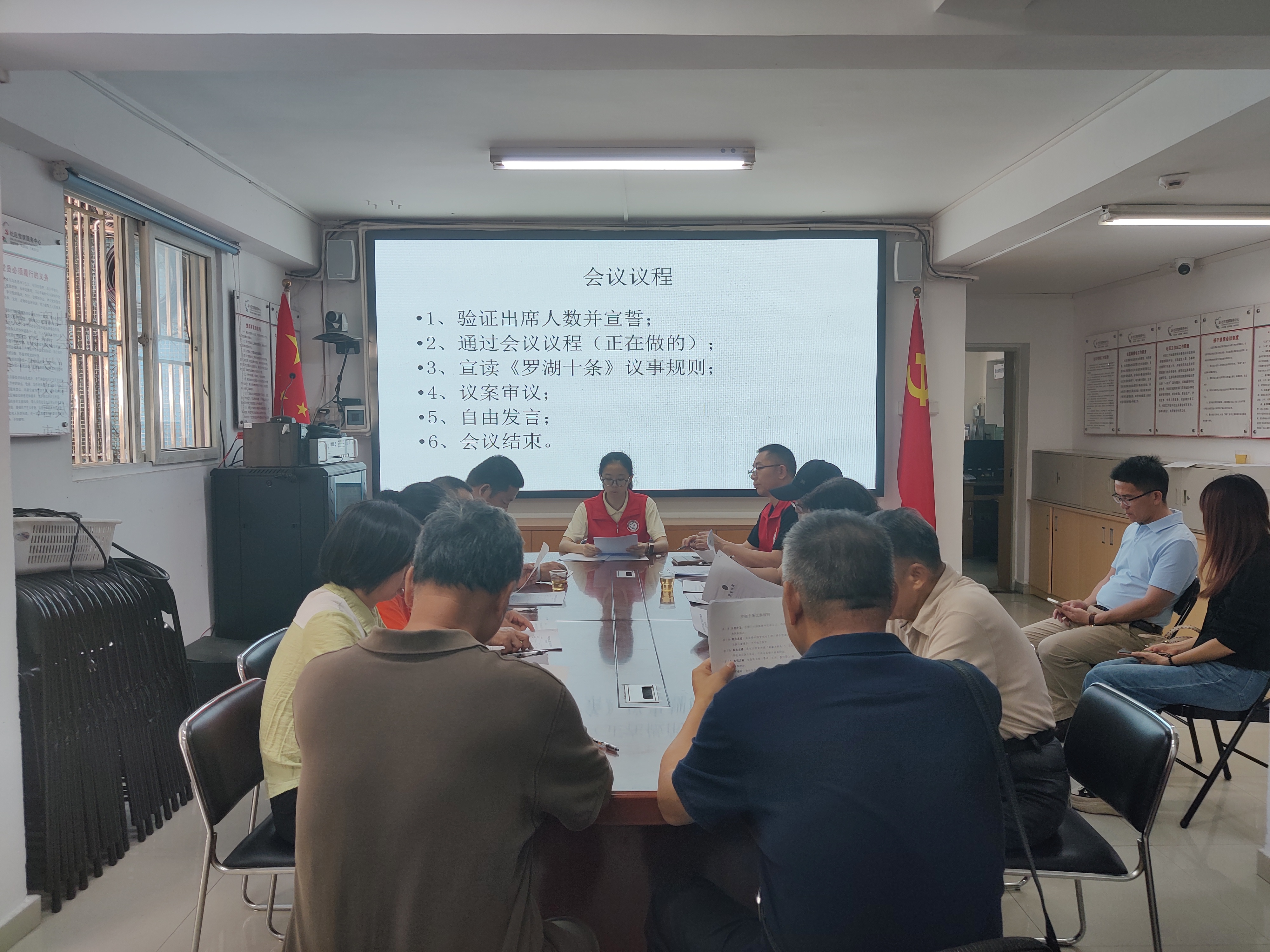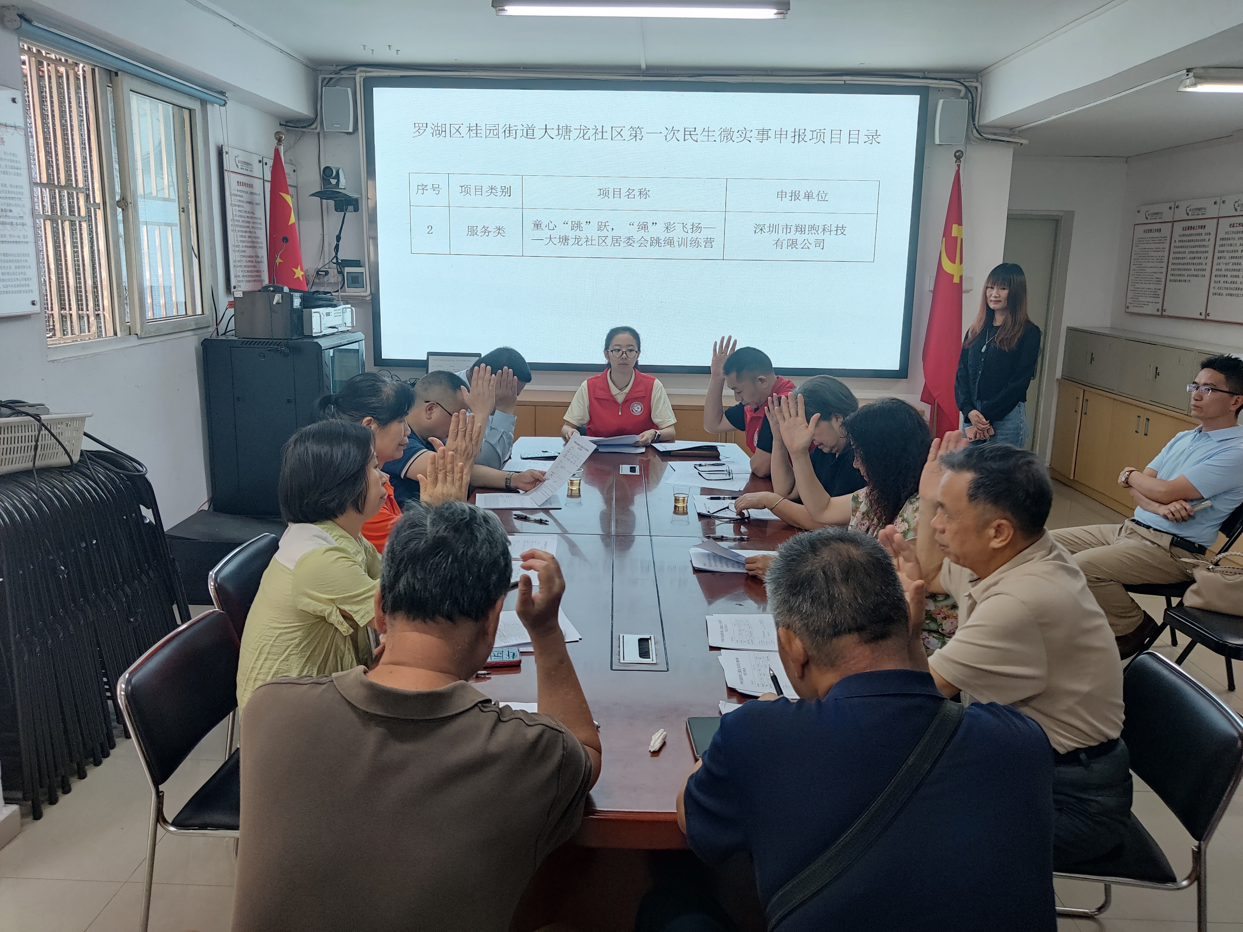 根据居民议事会规定本次议程有:验证出席人数、宣誓并宣读《罗湖十条》议事规则、项目陈述、审议议案、举手表决、自由发言,最后会议结束。本次审议的议案有2个服务类项目,即:《“节庆传情,邻里共融”大塘龙社区居委会节庆文化系列活动》、《童心“跳”跃,“绳”彩飞扬——大塘龙社区居委会跳绳训练营》;1个货物类项目,即:《银龄护安计划——大塘龙社区居委会筑牢家庭安全防火墙项目》。