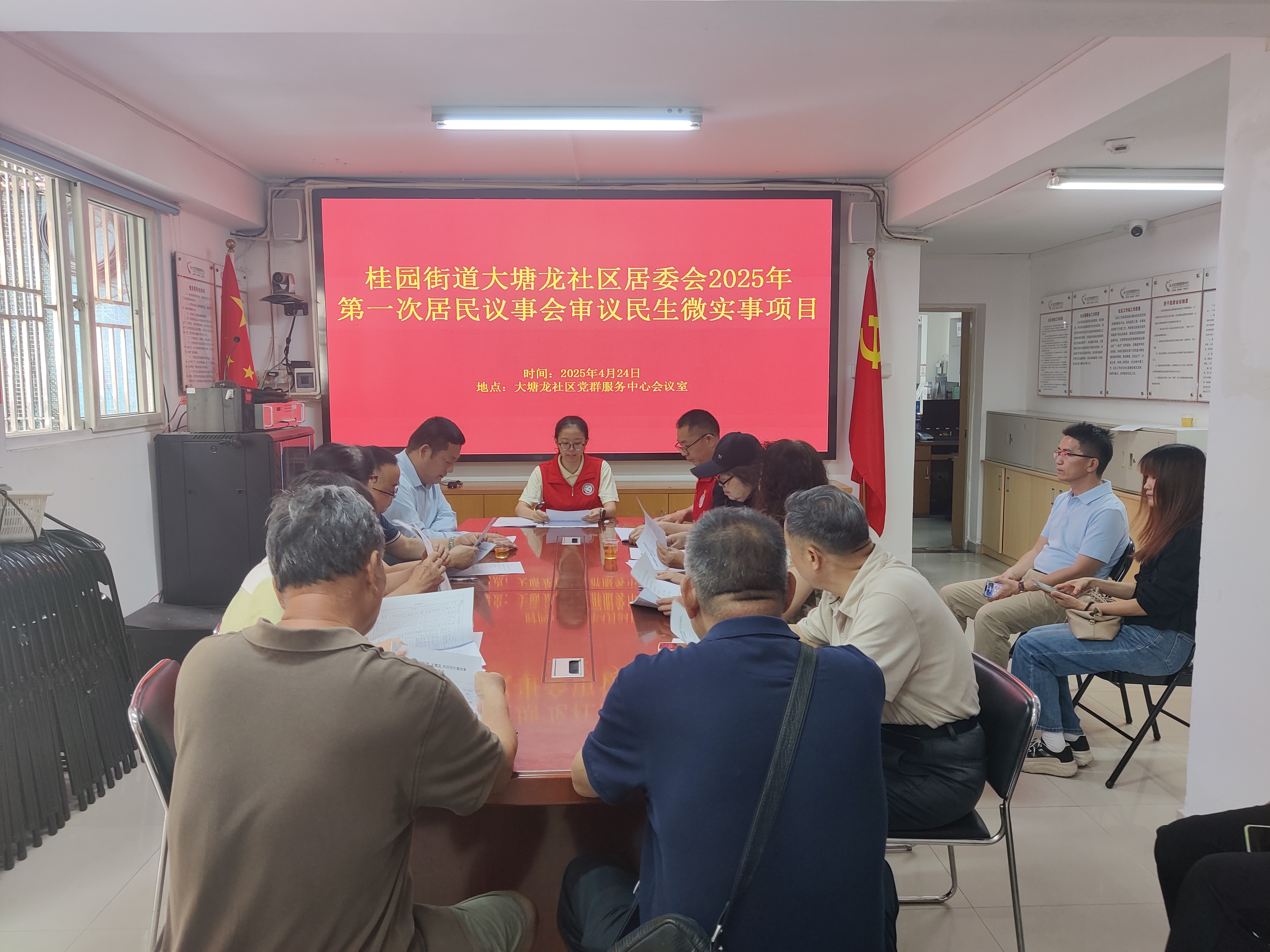 罗湖家园网讯:2025年4月24日上午,大塘龙社区居委会在大塘龙社区党群服务中心会议室召开“大塘龙社区居委会2025年民生微实事项目审议第一次居民议事会”。本次居民议事会共有10名议事代表出席,满足议事代表达到2/3的法定人数,会议符合规定程序,有效进行。