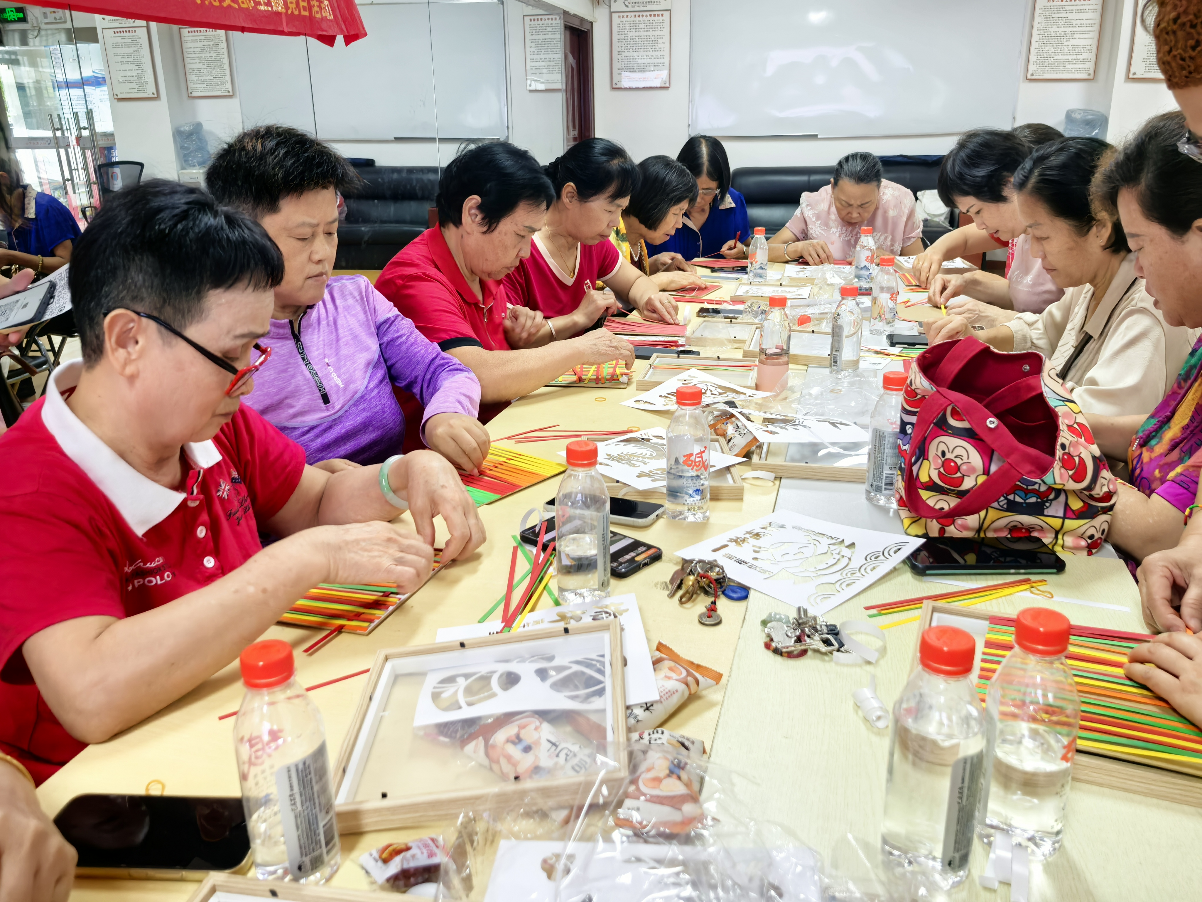 竹编是中国非物质文化遗产的重要组成部分。社工先为大家介绍了竹编艺术的历史渊源、独特价值和编织的基本技巧。现场的老人随着社工的讲解,从专心聆听到纷纷投入创意编织画的创作中。穿篾、压篾、挑篾…… 看似简单的动作,实际操作起来却需要十足的耐心和巧劲。有的老人尽管手指有些颤抖,但仍专注地将“不听话”的竹篾规律地排列;还有的老人发挥创意,在基础图案上添加了自己的想法,编织出独特的纹理。当老人们完成带着融入龙舟、粽子等图案的竹编画作品展示时,一张张布满皱纹的脸上洋溢着幸福的喜悦。
