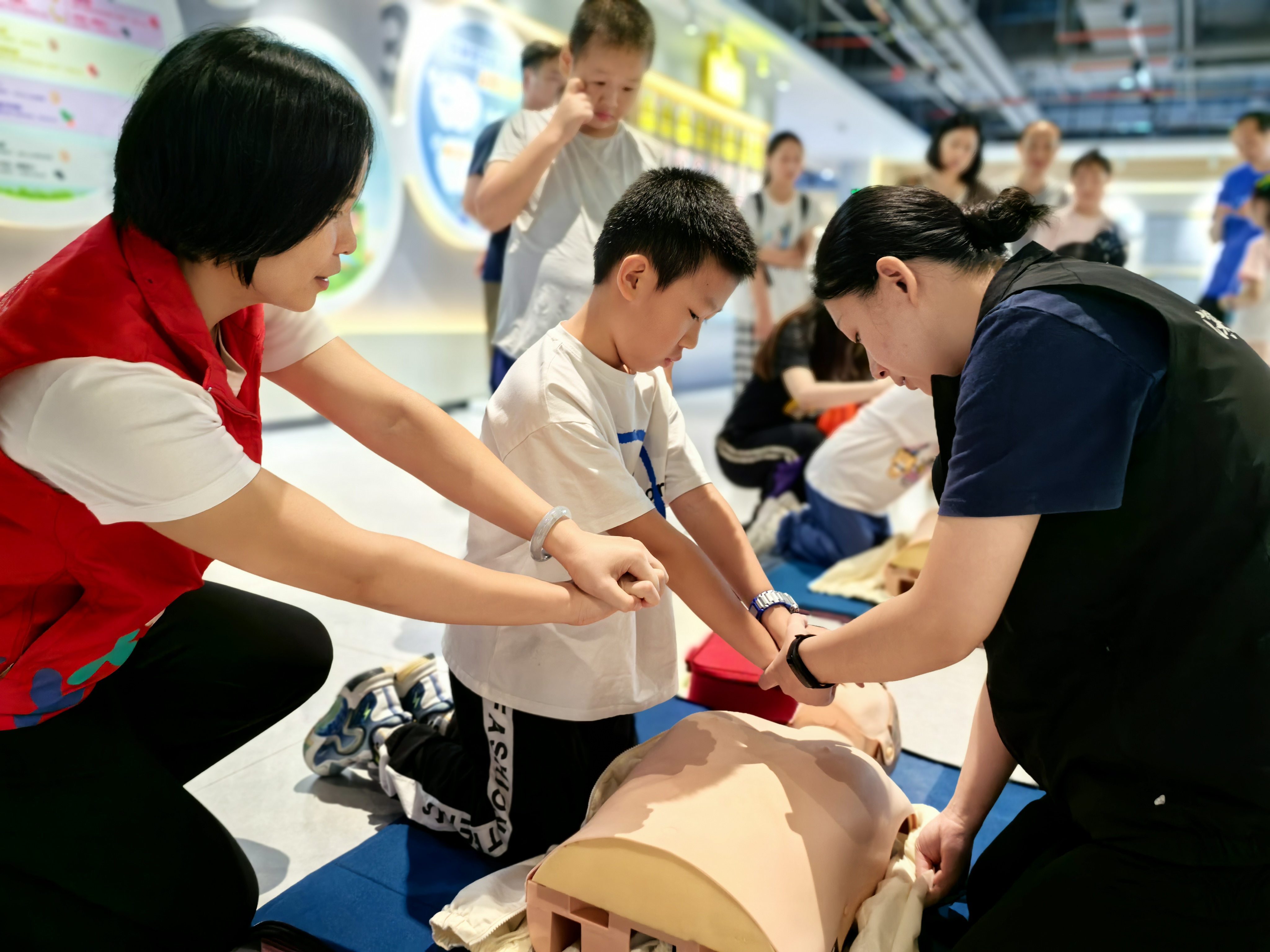 在防溺水主题区,孩子们认真聆听专业讲解,在工作人员的指导和社工的协助下进行心肺复苏实操训练。工作人员重点强调防溺水“四不要”,同时说明在溺水救援现场儿童可以协助去做的事情,引导家长和孩子不要做旁观者。模拟拳击体验区、警用装备体验区以及VR互动区,更是将安全知识转化为可触摸、可操作的真实技能。孩子们通过模拟场景应对、装备亲身体验和虚拟现实技术,身临其境地感知风险,学习如何在紧急情况下保护自己,有效为平安假期筑起第一道防线。现场家长纷纷向社工表示,此次活动太有意义了!不仅能让孩子学到各种与警察相关的知识、全方位的安全自护知识,还能培养他们的社会责任感。