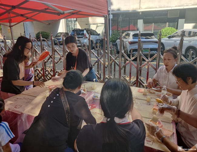非遗美食、工艺体验区则汇聚了多种非遗与民俗体验项目。非遗糖画摊位前,手艺人以勺为笔,以糖为墨,勾勒出玉兔、明月等充满节日元素的造型,令人赞叹;团圆冰皮月饼制作点充满了温馨与甜蜜,居民们亲手揉制饼皮、包裹馅料,压模成型,在协作中品味中秋团圆的幸福滋味;在非遗漂漆扇摊位,居民们发挥创意,制作出色彩斑斓、饱含祝福的漆扇,感受传统工艺与现代审美碰撞的火花。