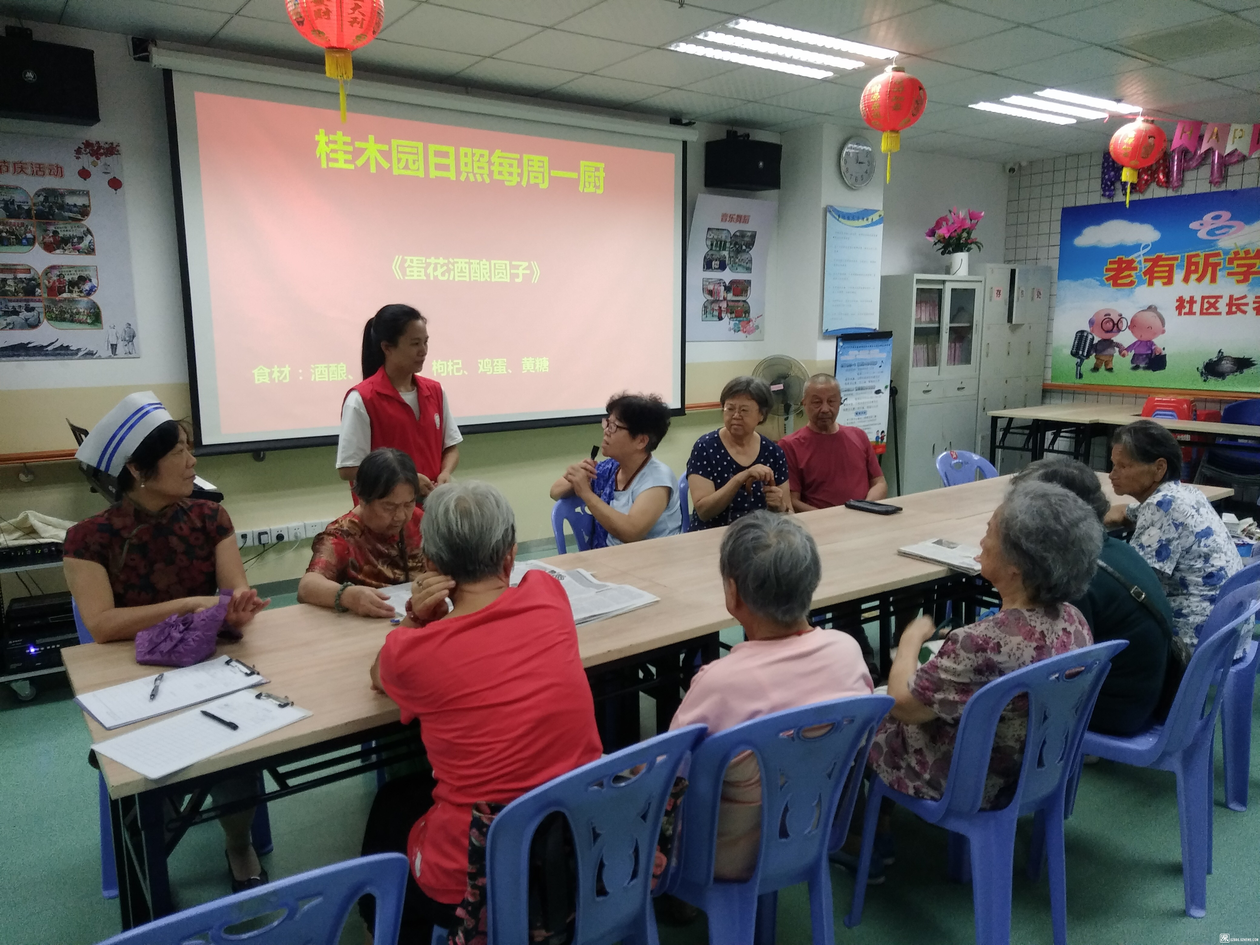 8月7日,由社区社工教大家制作《蛋花酒酿圆子》,这款甜酒在广东大部份地区的月子餐里都会遇见,社工先给大家一一陈述了制作方法,大家将事先准备好的食材,有条不紊的分工合作,有的长者负责打蛋液、有的负责煮红糖水,活动过程中参与者都纷纷分享自己的下厨心得,大家一起讨论、互相配合与分工以保证制作出最完美、美味的成品一起品尝。