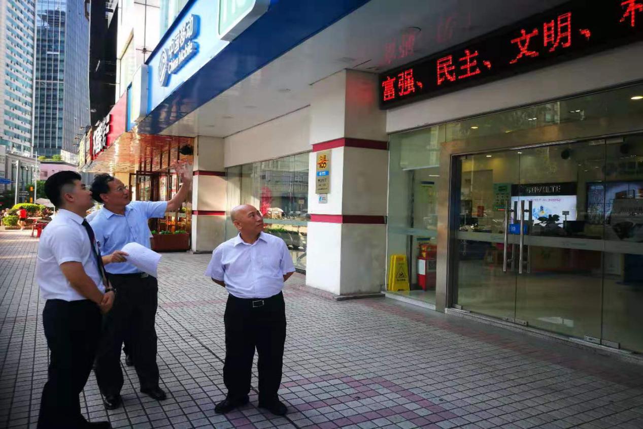 问题四在桂木园社区创文检查点(深港豪苑中国移动营业厅),街道领导手拿《罗湖区2019年全国文明城市创建实地考察点测评标准》清单逐一比对,对营业厅内的创文宣传品摆放提出建议,对营业厅门口的LED屏故障,提出整改建议。