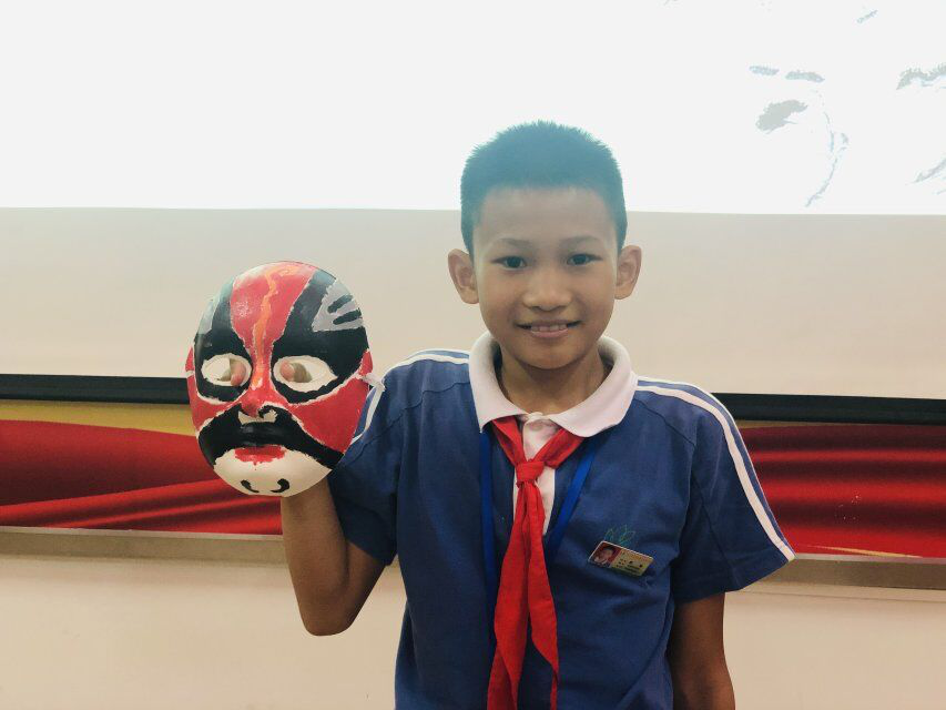 在画脸谱之前,社工给参与者介绍了国粹京剧,京剧脸谱在舞台上的作用,脸谱上的各种色彩所表达的人物性格,通过PPT让孩子们更形象地了解京剧脸谱。孩子们听得认真,所以在“猜猜我是谁”的互动小游戏里都快而准的说出了京剧扮相的人物角色;绘制环节老师的讲解中提到脸谱要对称、线面结合、色彩鲜明。孩子们紧记这几点开始兴致勃勃地在面具上勾勒出脸谱轮廓,再手握画笔涂颜抹色。小林同学问到:“黑色象征正直、豪爽,老师你看我画的张飞好看吗?”没等颜料干透就把所画的脸谱带上了。