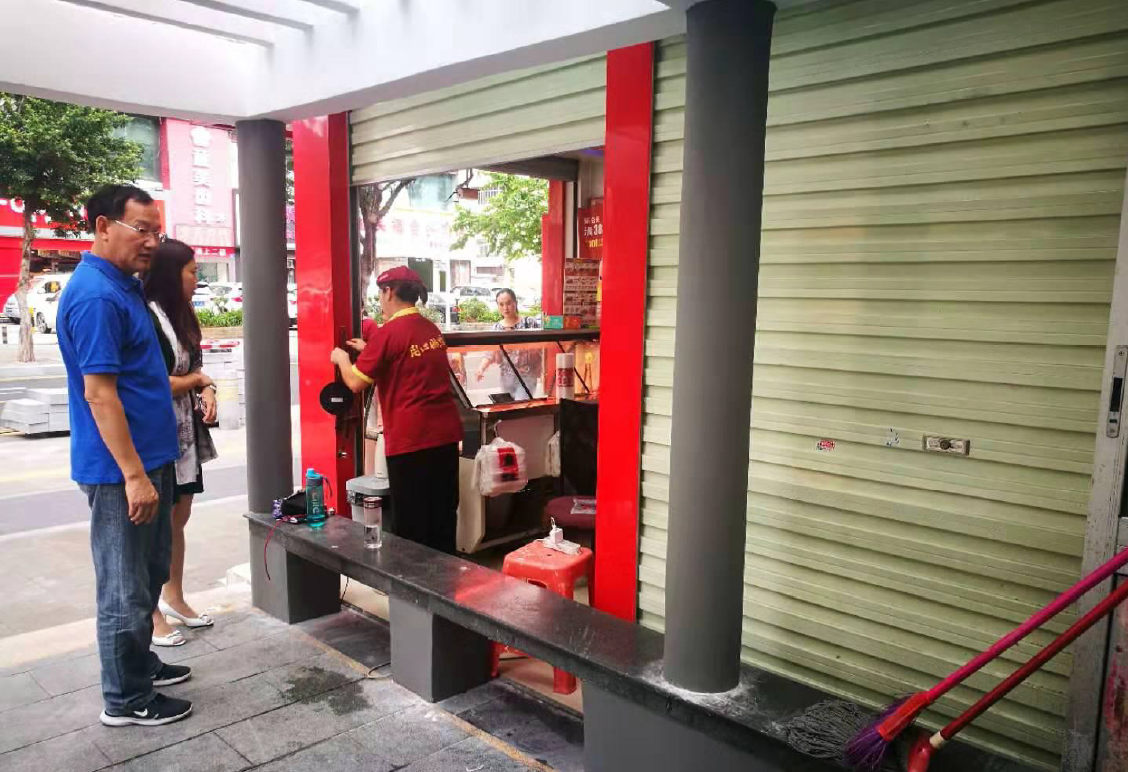 问题四在桂园路,发现有商家把清扫工具摆放在休憩长廊的石凳上,社区驻点第一书记高树宝上前制止,并要求商家立即摆放回商铺内。