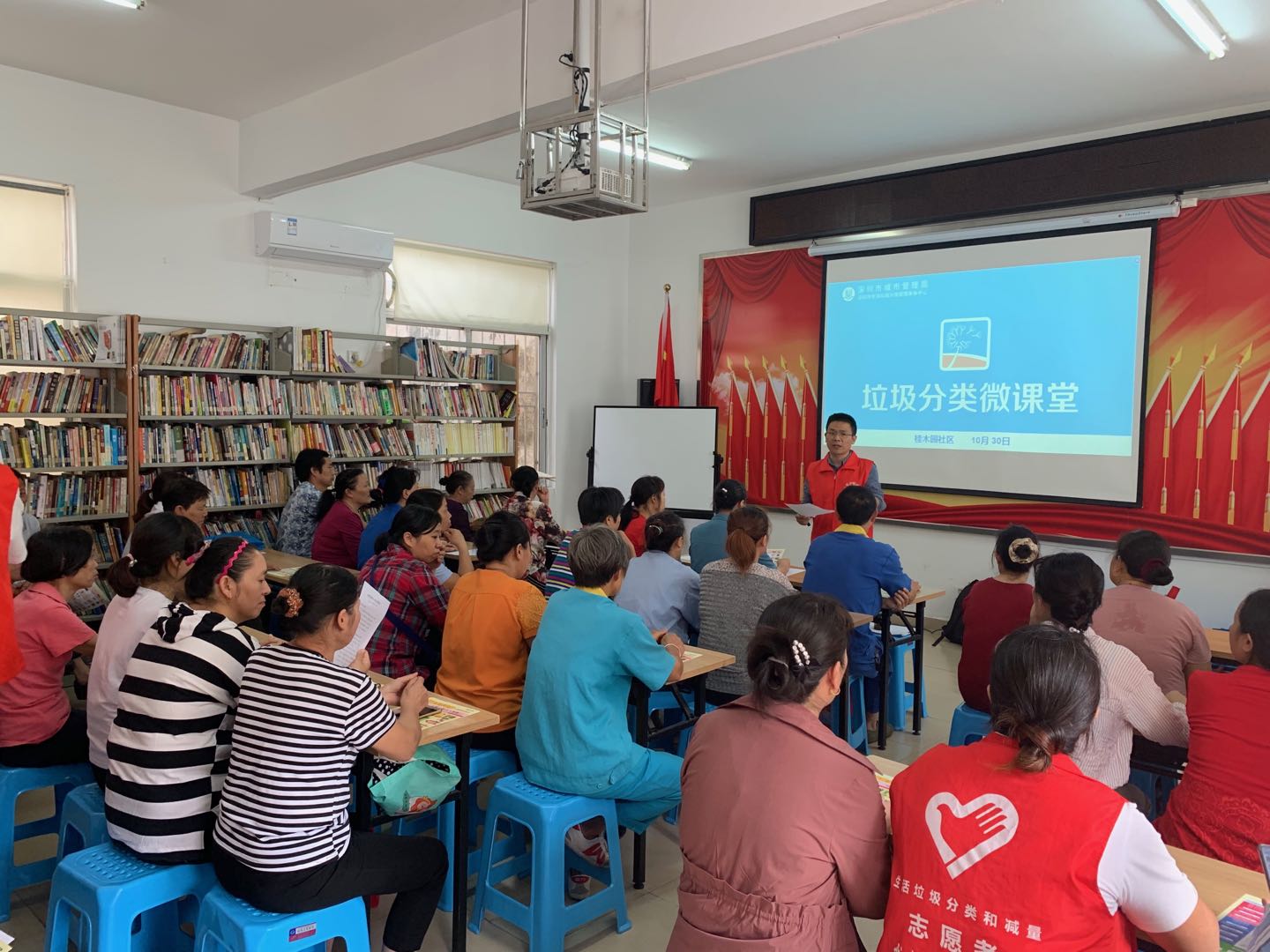 罗湖区家园网讯:2019年10月30日下午,垃圾分类“微课堂”在桂木园社区党群服务中心多功能室开展了垃圾分类督导员培训会,近50位桂园街道各小区的夜间垃圾分类督导员参加。本次培训对督导员在19-21点期间对居民的垃圾分类投放进行现场指导和示范,讲师指出在进行督导时遇到不理解的居民要耐心进行讲解,将垃圾分类的知晓率、参与率、继续传播出去。同时为做好创建文明城市工作,在做好垃圾分类督导外还配备了《深圳市民文明手册》、《争做文明市民,共创文明城市的致广大居民朋友的一封信》,等宣传材料,派发给各社区居民。