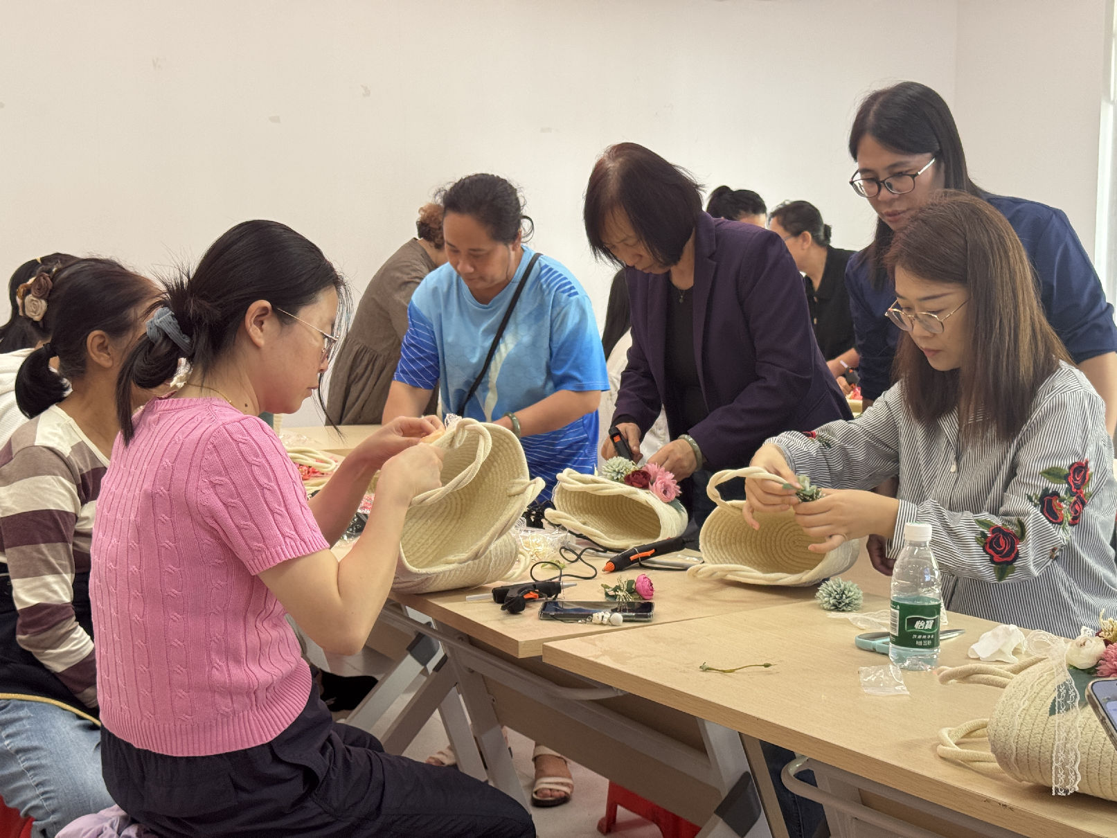 “大家先别急着动手,咱们先看看草编包的版型,蕾丝可以沿着包口边缘贴,花朵则可以根据喜好点缀在包身侧面或正面……” 活动伊始,手工老师手持样品包,耐心讲解装饰技巧与搭配思路,从蕾丝花边的优雅贴合,到丝带、布艺花朵的层次组合,从胶水用量控制到装饰位置对称,每一个细节都讲解得细致入微,为大家打开了创意的大门。随后,妇女们纷纷拿起草编包,开始构思自己的设计方案。