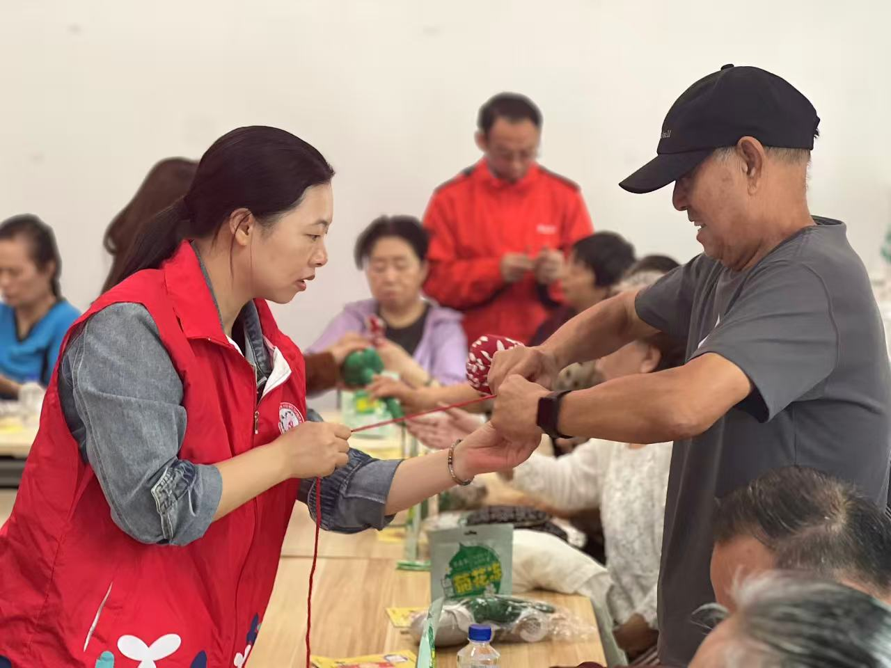 与此同时,已经完成艾灸的长者则到手工活动区域体验艾草锤制作。社工耐心指导长者们将艾绒等天然材料细心包裹、捆扎、制作成一个个小精致的艾灸锤。这不仅是实用的养生工具,可以用于日常敲打经络、舒缓疲劳,更是一件凝聚了心意与祝福的手工艺品。大家互相帮助,活动现场充满了欢声笑语。