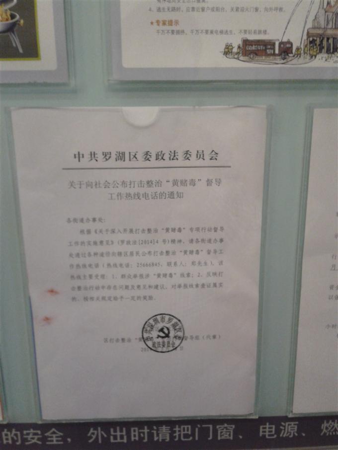 根据《关于深入开展打击整治“黄赌毒”专项行动督导工作的实施意见》(罗政法【2014】4号)精神,请各街道办事处通过各种途径向辖区居民公布打击整治“黄赌毒”督导工作热线电话(热线电话:25666845,联系人:郑先生)。该热线主要受理:1、群众举报涉“黄赌毒”线索;2、反映打击整治行动中存在问题及意见和建议。对举报线索查证属实的,按照相关规定给予一定的奖励。