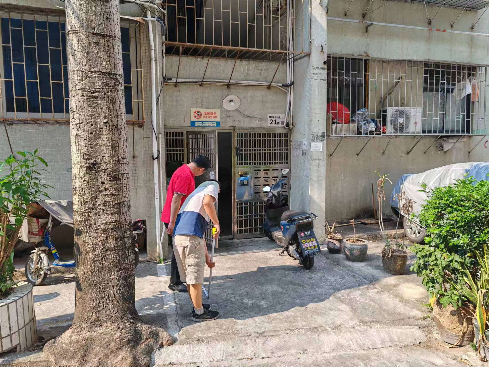 红村社区工作站副站长带领电梯公司到广场北街小区查看现场,了解是否可安装电梯事宜