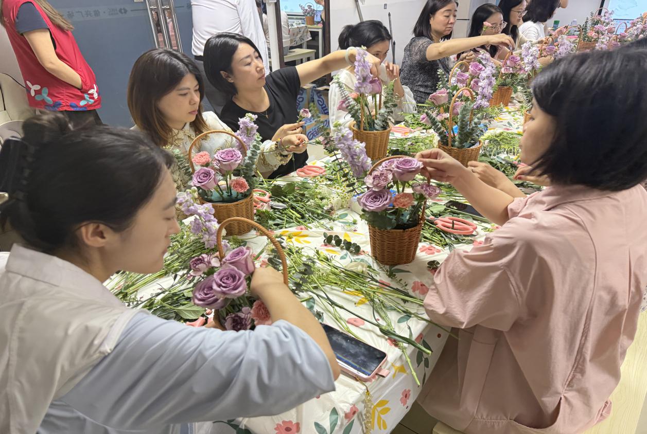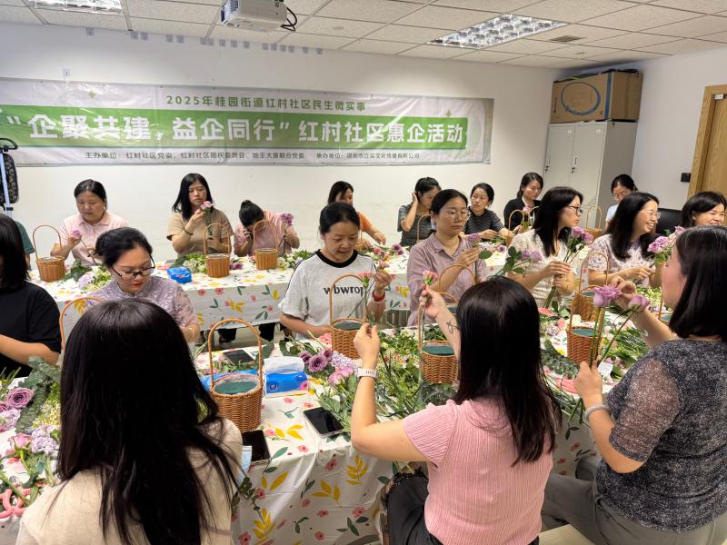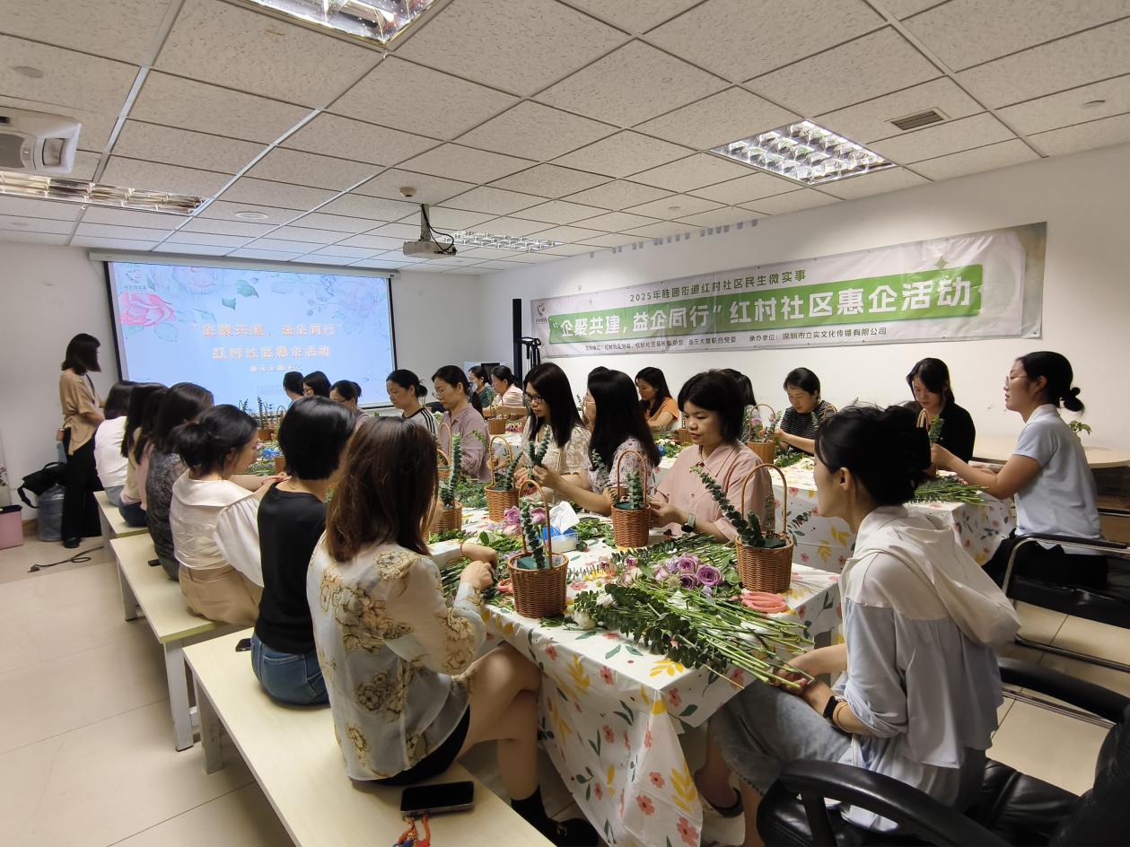 罗湖家园网讯:5月23日(周五)下午,由红村社区党委、红村社区居委会联主办的2025年民生微实事项目——"企聚共建,益企同行"惠企活动,在地王大厦开展。本次活动以"艺术疗愈+手工体验"为核心,吸引了25名来自辖区企业的职工参与,通过插花创作缓解职场压力,增进企业交流。