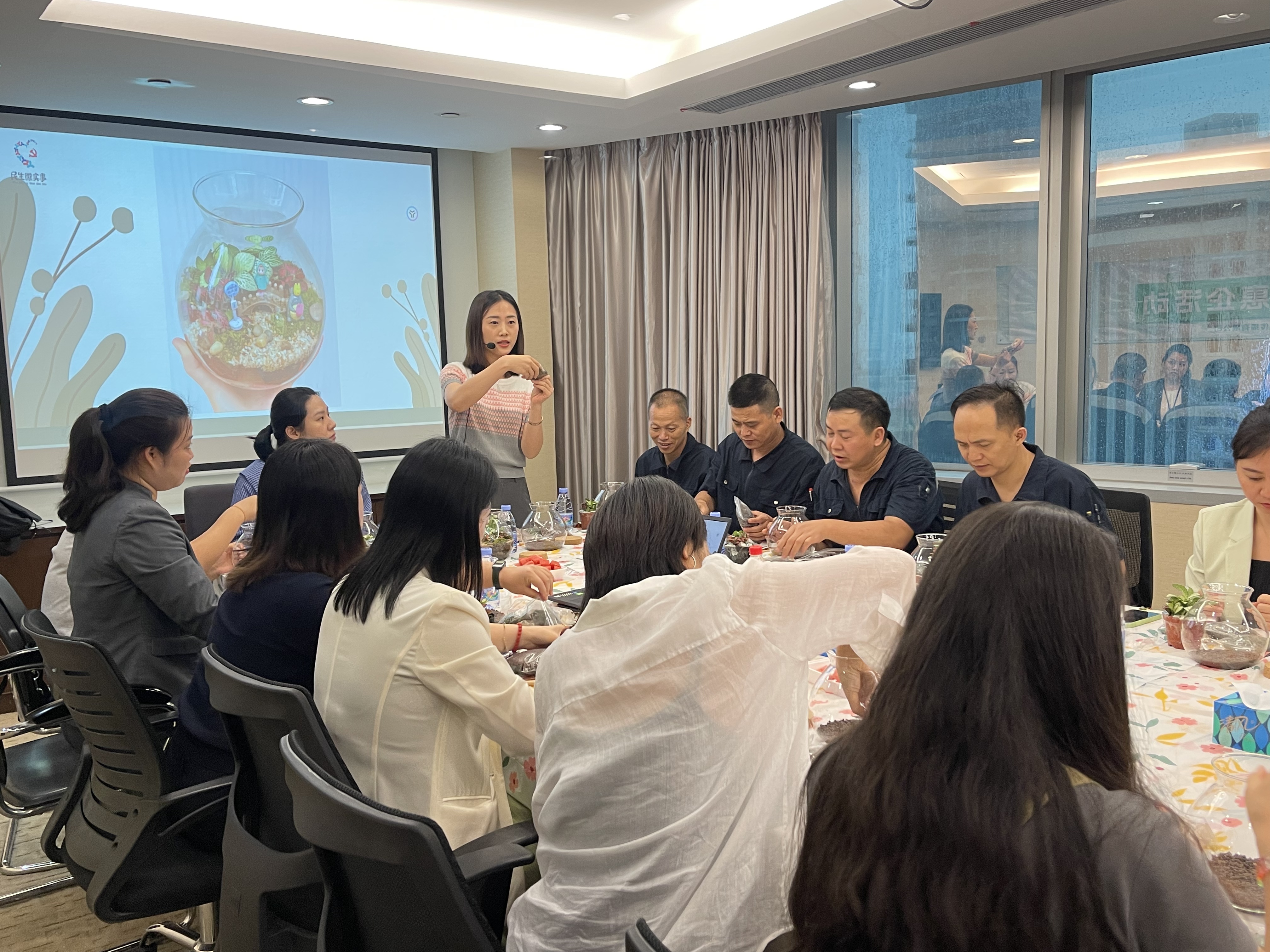 ,在地王大厦熊谷物业二楼会议室开展。本次活动邀请25位企业职工参与,以绿植组合盆栽手工为主题,通过引入“艺术疗愈+手工体验”融合模式,开展企业职工心理减压手工活动,帮助参与职工在沉浸式创作中做到情绪宣泄,缓解企业职工职场压力。