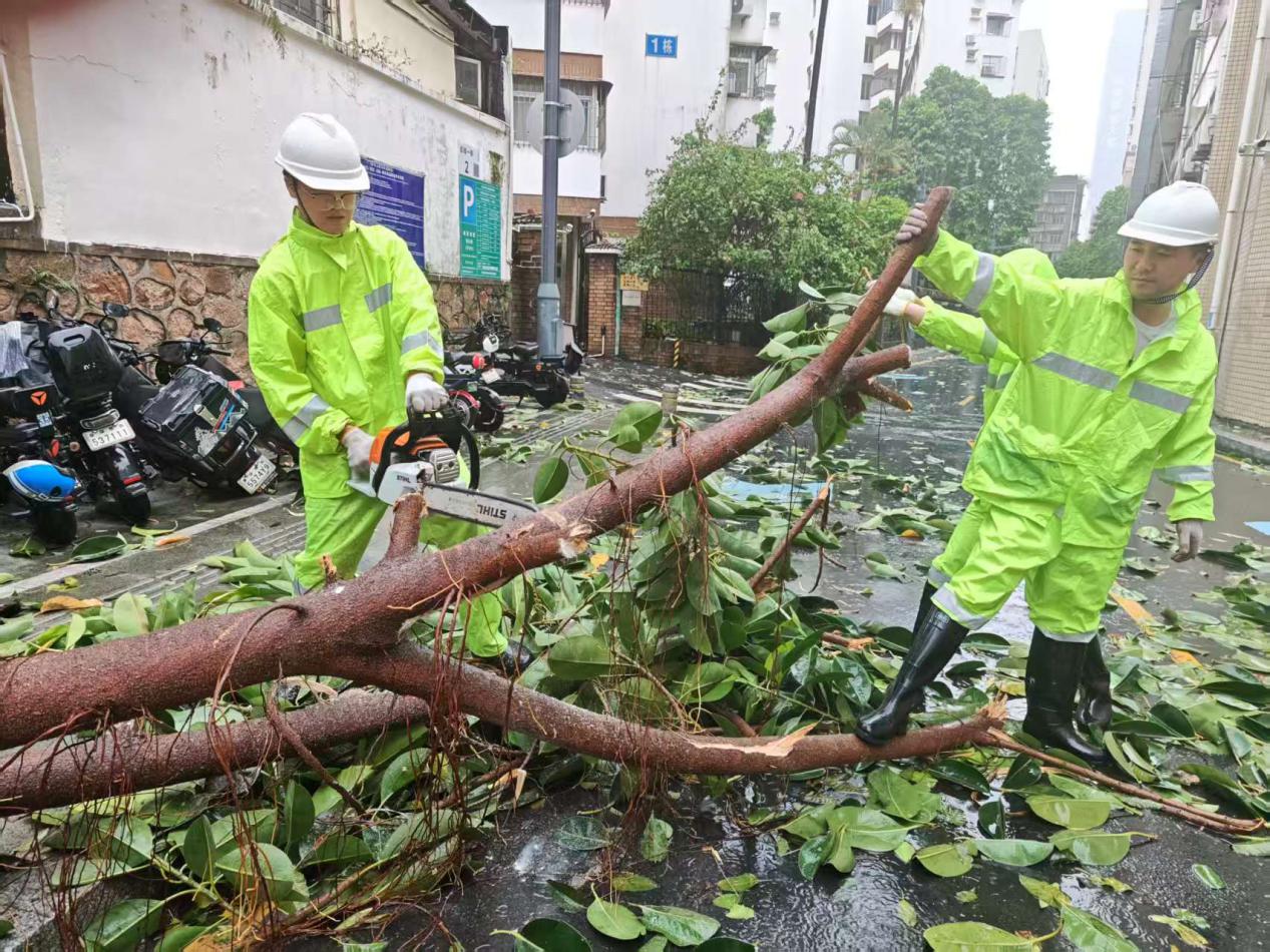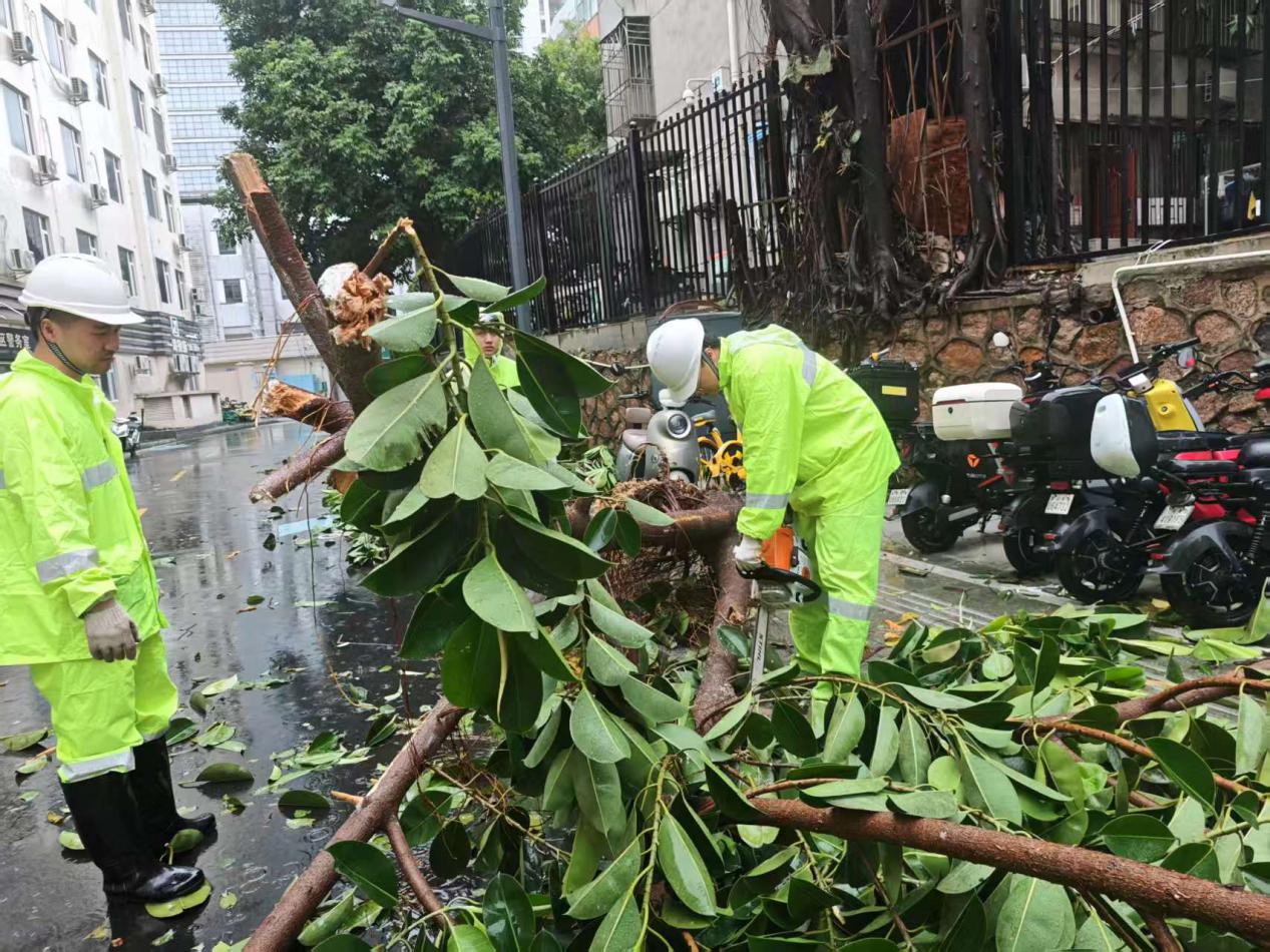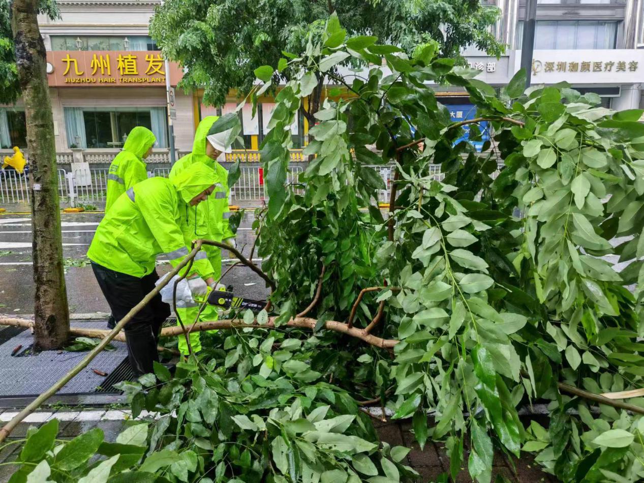 为及时疏通台风后道路通畅,确保交通出行安全,红村社区党委立即启动应急响应,全员上岗,组建多支“应急队”,采用“机械作业+人工清扫”结合的方式,分别对红岭中路一整条路以及红宝路、解放路以及广场北街、宝安南路至红宝路交叉路口、红岭路、红桂一街、二街、红宝大厦宝安南路至华讯路段等展开“地毯式”清理。宝安南路至红宝路交叉路段有树木被吹倒,影响车辆通行。工作人员迅速到现场处置,从发现险情到恢复通车总计用时仅25分钟。此外,他们还对宝安南路多条主干道路沿线进行全面巡查,清理树木断枝隐患15处。