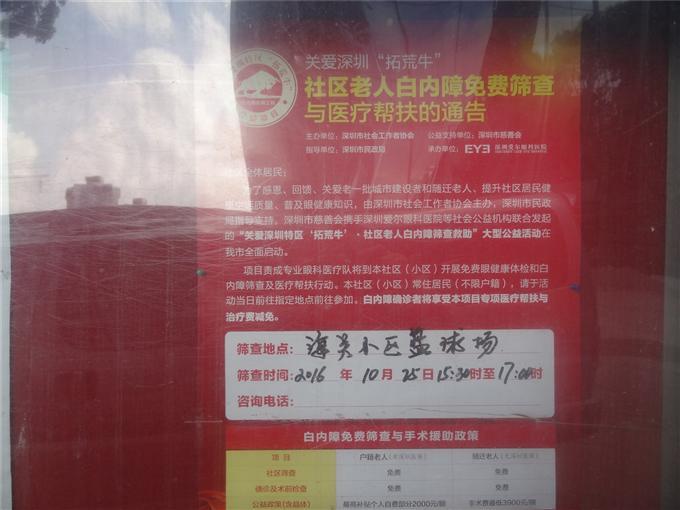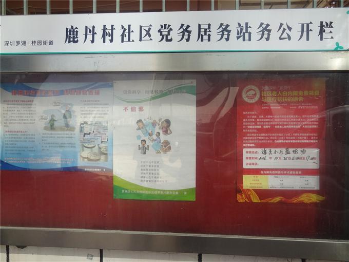 鹿丹村社区工作人员张贴“社区老人白内障免费筛查”通告