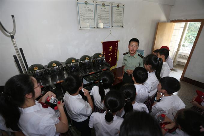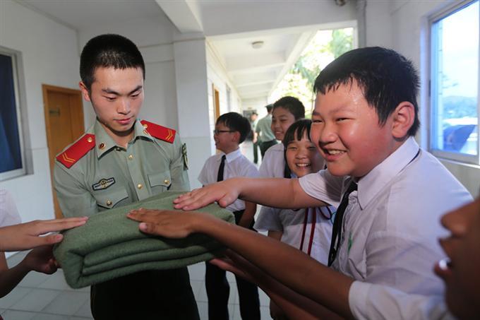 精彩纷呈的表演后,同学们来到战士们的宿舍,一起学习如何叠好一张“豆腐块”被子。在简单朴素的房间里所有的物品井井有条,其中,警棍、手铐等是他们日常抓捕偷渡客的常用工具。然而,最吸引大家目光的是一面“第一名”的旗帜,那是这个房间里战士们的荣誉。