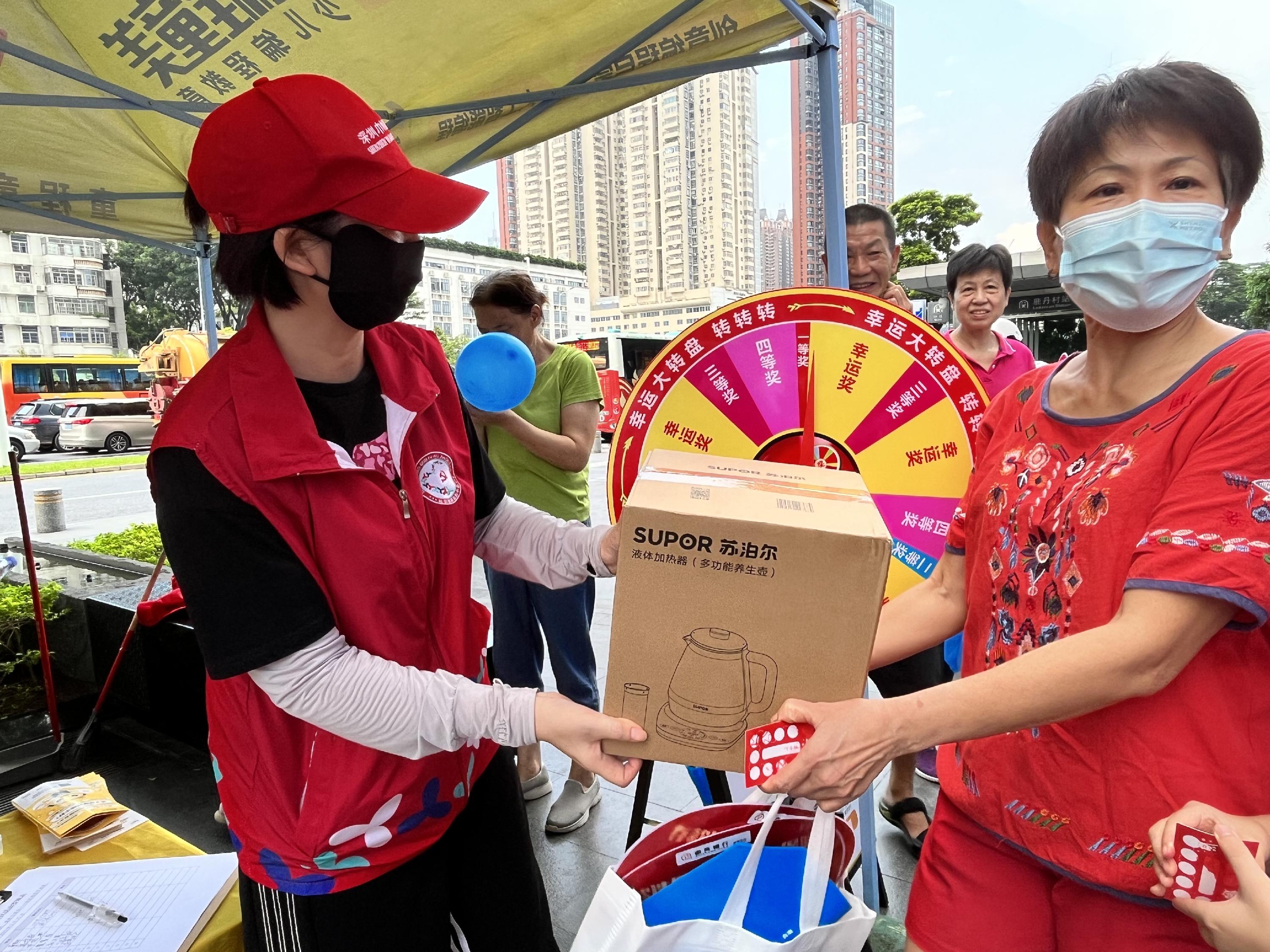 整个广场都沉浸在热闹的氛围中,游园活动区内设有健康养生体验、美食品尝、爱国主题打卡和欢乐抽奖等多个互动项目。居民们纷纷参与其中,在互动中收获快乐,感受幸福。