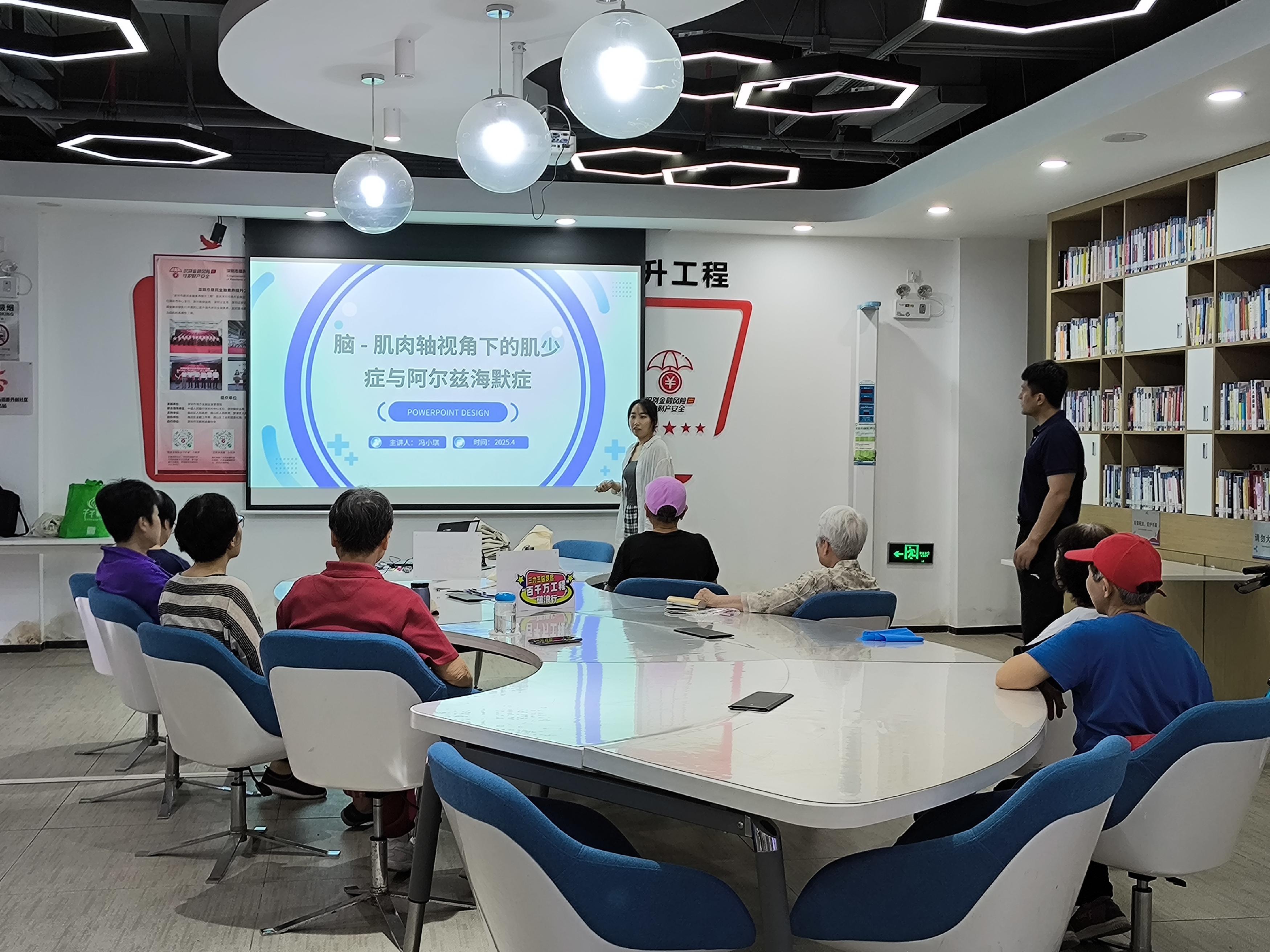 活动伊始,治疗师详细讲解了脑-肌肉轴的工作原理,以及肌少症与阿尔茨海默症之间的关联:“当肌肉质量下降时,它向大脑传递的信号会发生改变,影响大脑的营养供给和神经调节;而大脑功能衰退又会导致运动指令的传递出现障碍,进一步加重肌肉萎缩。所以,从脑-肌肉轴视角进行综合干预,对预防和改善这两种疾病至关重要。”居民们认真聆听,不时拿出手机拍照记录重点内容。