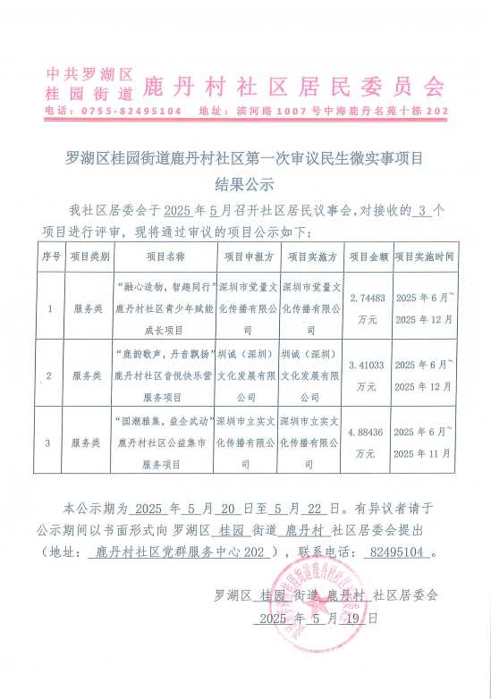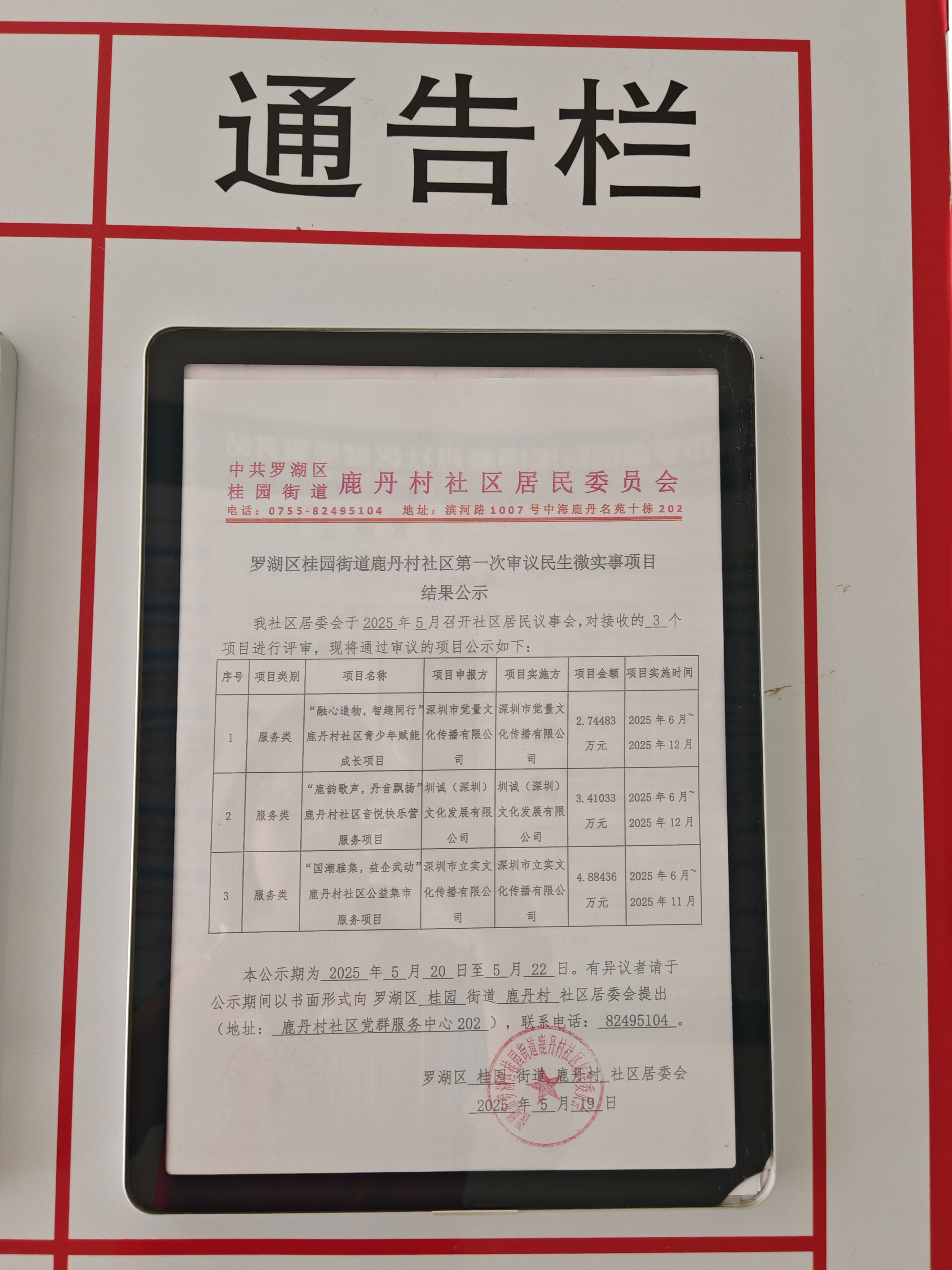 罗湖区桂园街道鹿丹村社区2025年第一次审议民生微实事项目 结果公示