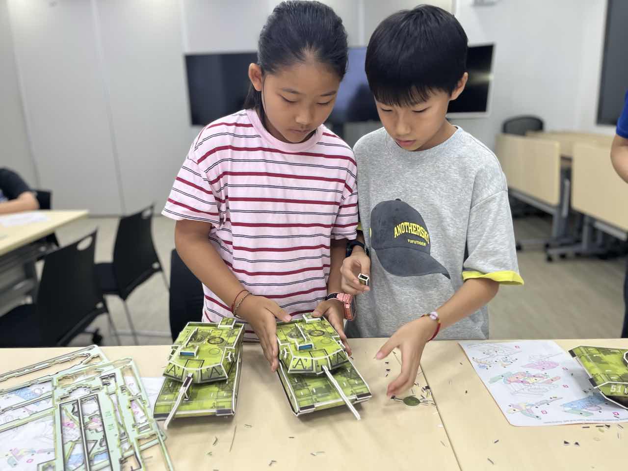 知识讲解结束后,模型制作环节正式拉开帷幕。讲师为每位青少年分发坦克模型套件,并耐心讲解拼装步骤与注意事项。在制作过程中,青少年们充分发挥动手能力和创造力。遇到零件组装困难时,青少年们还互相帮忙,分享自己的组装技巧。