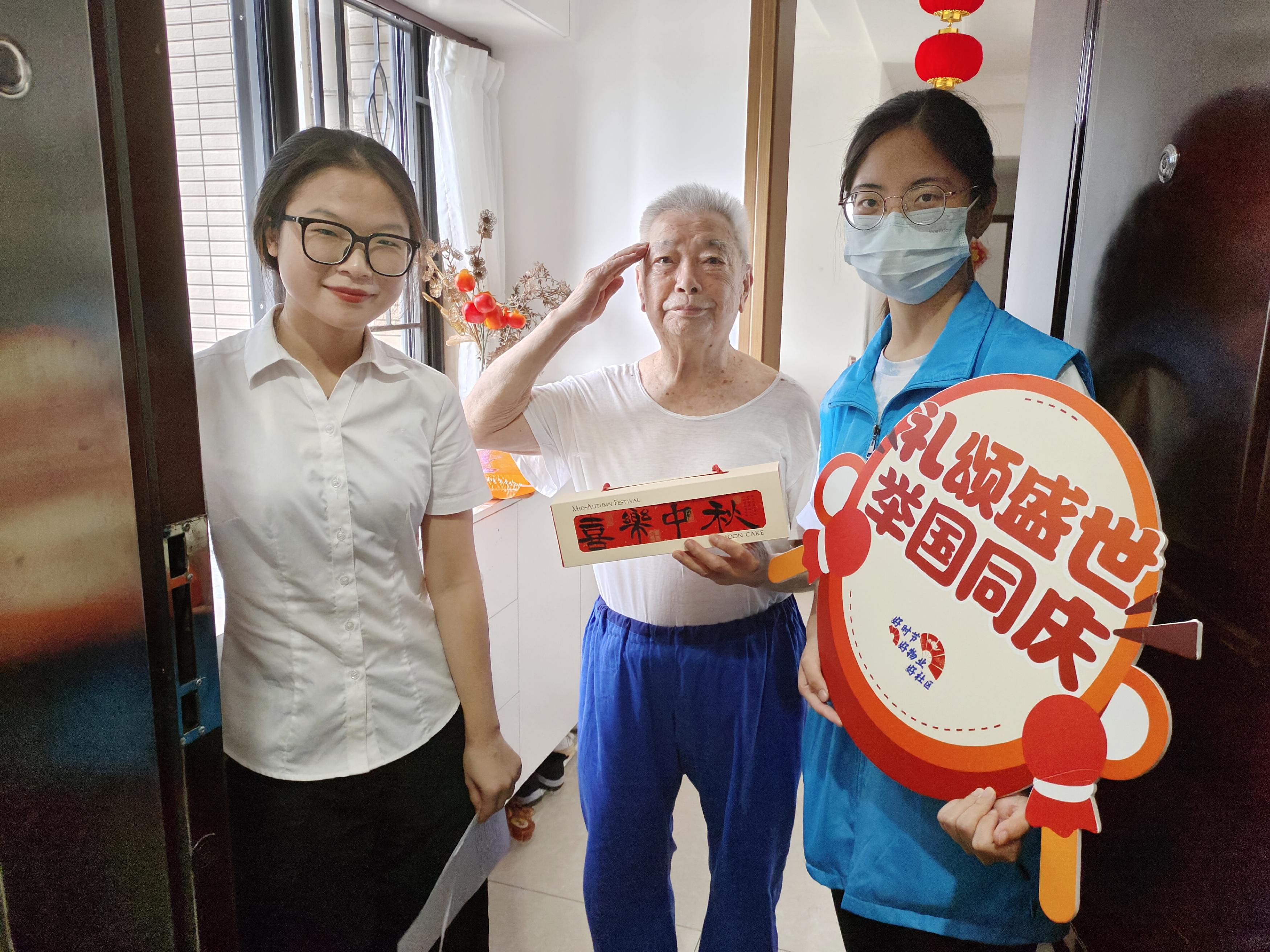 当天下午社工携手物业、志愿者一同上门探访困境儿童、独居老人、高龄老人等特殊群体20户,为他们送去月饼与节日问候,并详细询问服务对象的身体及生活情况,叮嘱他们有困难可及时向社区反映,用实际行动传递 “团圆、关爱” 的节日内涵。退伍海军黄爷爷说:“感恩现在的美好生活,敬个军礼感谢祖国!”