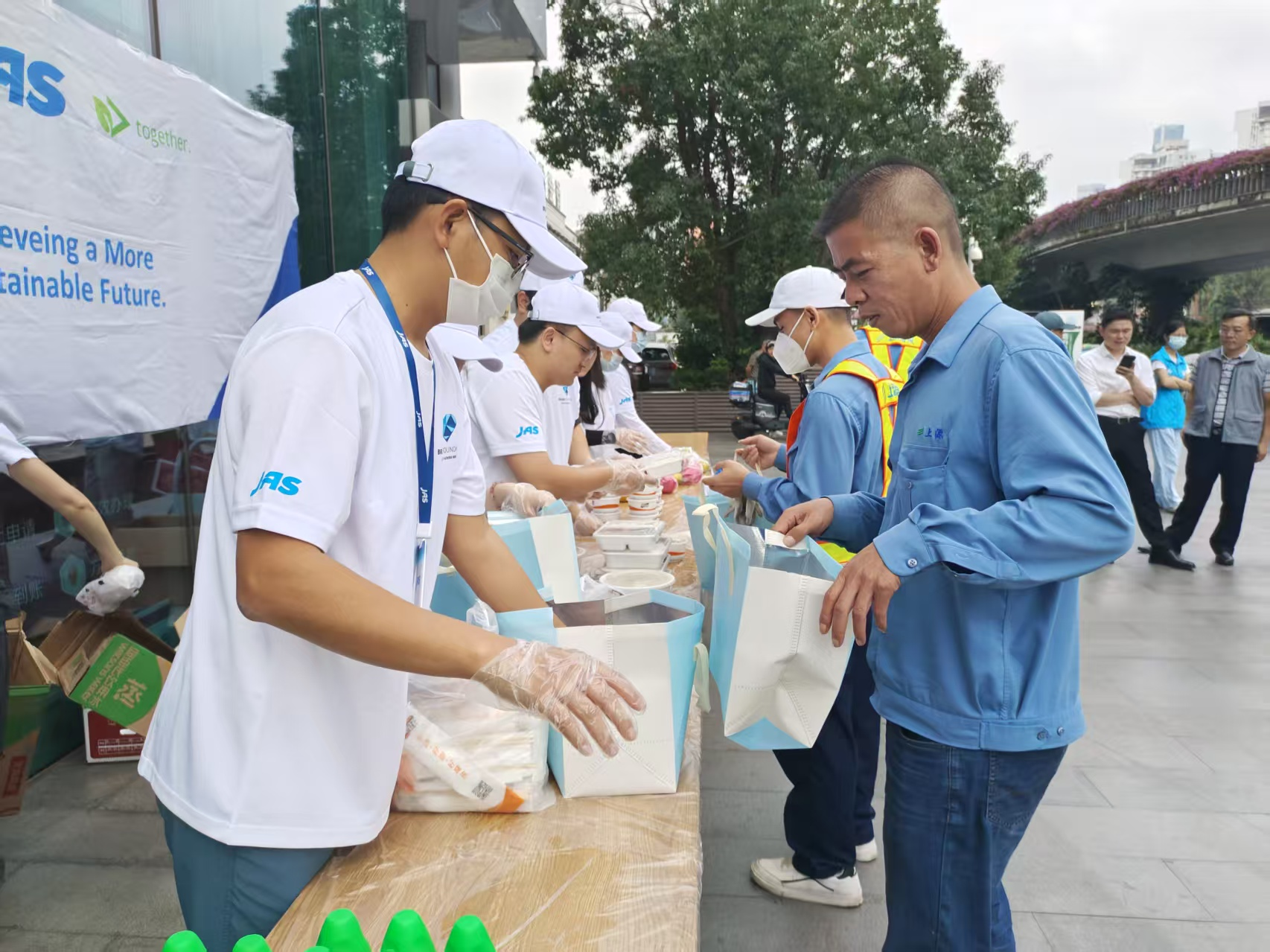 罗湖家园网讯:为深入贯彻落实“百千万工程”决策部署,推动优质服务资源向基层一线下沉,2025年10月29日,鹿丹村社区联合捷爱士国际货物运输代理(上海)有限公司深圳分公司,共同开展了一场爱心送餐活动,为辖区内80余名一线环卫工作者、外卖员、快递员以及防蚊媒消杀工作人员送上热气腾腾的午餐。