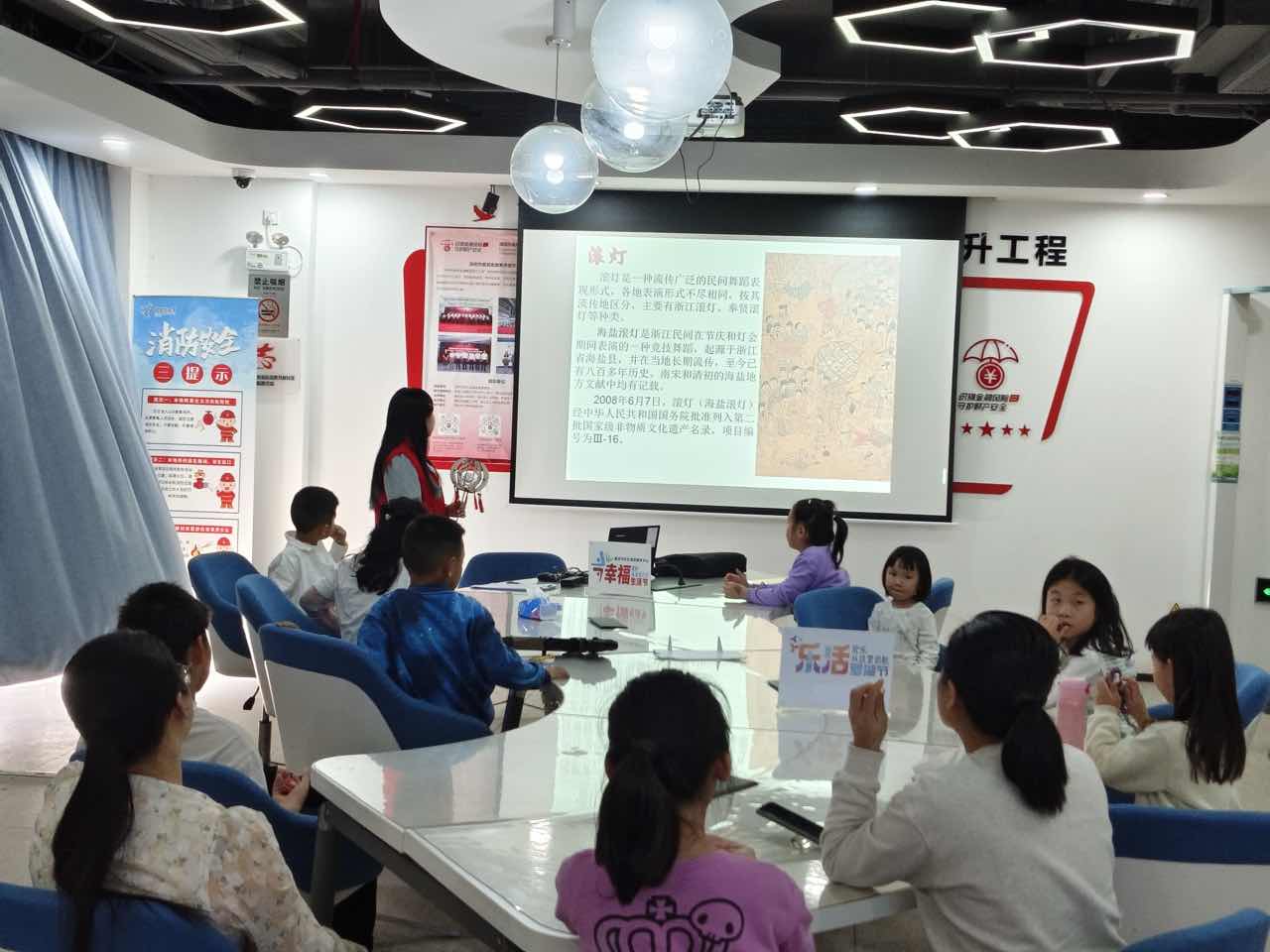 在民俗分享的热烈氛围中,活动进入非遗文化探秘环节。社区社工以“会翻滚的灯”为悬念,引出国家级非物质文化遗产——海盐滚灯的传奇故事。社工结合史料记载与民间传说,生动讲述了海盐滚灯八百多年的传承历程:它起源于浙江海盐,因古代当地百姓需抵御海患与海盗,逐渐形成以滚灯竞技比武的尚武风气,红心灯与黑心灯的比武习俗更成为民间实力的象征。社工还通过视频展示了滚灯表演中“张飞跨马”“开荷花”等经典动作,以及锣鼓伴奏下腾掷旋转、灯不灭壳不碎的精湛技艺,让孩子们直观感受这项非遗技艺“南派婉约与尚武精神兼具”的独特风格。当得知海盐滚灯已入选国家级非物质文化遗产名录,且在元宵灯会等节庆中代代相传时,孩子们纷纷发出赞叹,对这项古老民俗充满了好奇与向往。