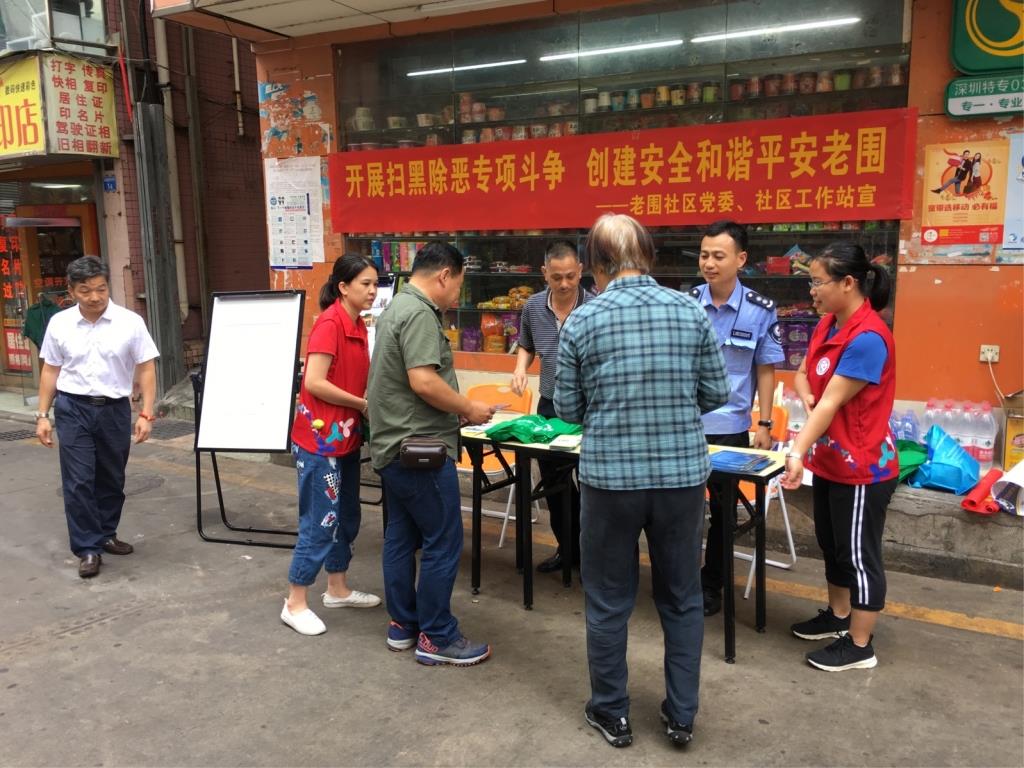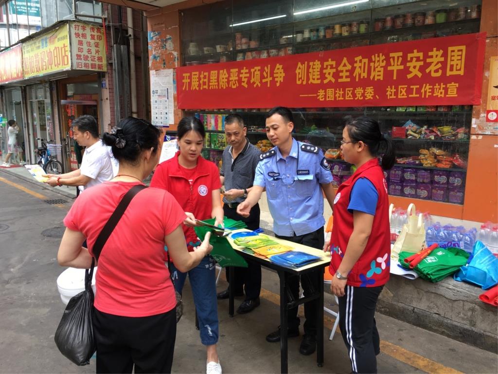 5月11日下午,老围社区为充分调动广大人民群众参与扫黑除恶专项斗争的积极性,进一步畅通举报渠道,方便群众举报涉黑涉恶线索,按照街道综治办要求,在各个小区张贴扫黑除恶举报电话公告,并同步开展宣传活动,现场发放宣传资料230余份,小礼品180余份。