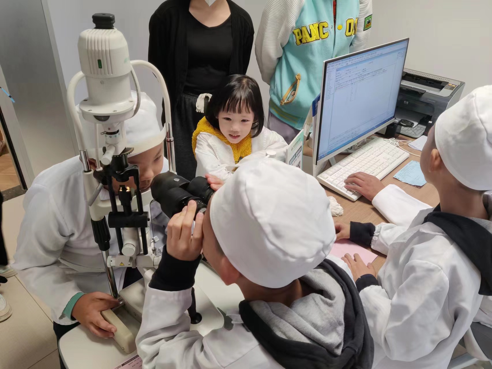接下来,眼科的张医生为大家带来“岗前培训”,在欢乐的课堂上,通过讲解眼球的构造、儿童视觉发展的变化,孩子们明白了科学防控近视。并化身小眼医,在验光师的指导下,亲自实操体验视力检查和电脑验光,还给小伙伴们做视力检查。眼科医生还为孩子们开展视力筛查,并为每个孩子建立了视力健康档案,让家长能够针对孩子的视力问题做进一步详细检查。