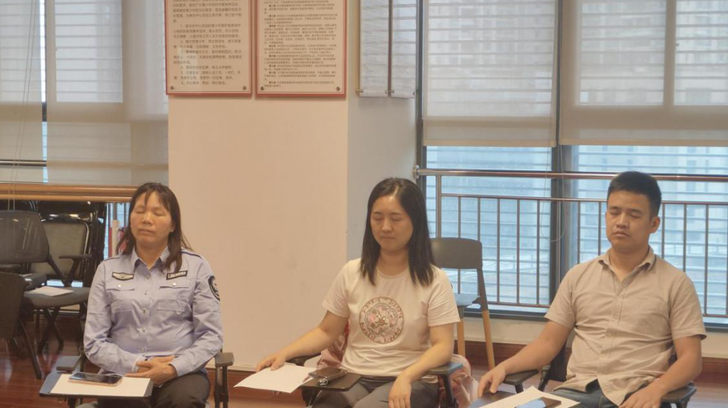 随后心理咨询师带领着体验了正念减压。大家在碰铃声中闭上双眼,关注自己的呼吸,关注当下的感受,压力在这样的自我关怀中得到被缓解。在分享环节,社区工作人员陈扬涛说:“在碰铃声中,我仿佛进入了一个全新的世界,感受到了前所未有的宁静与放松。”