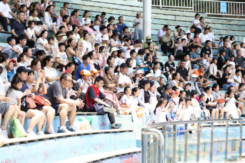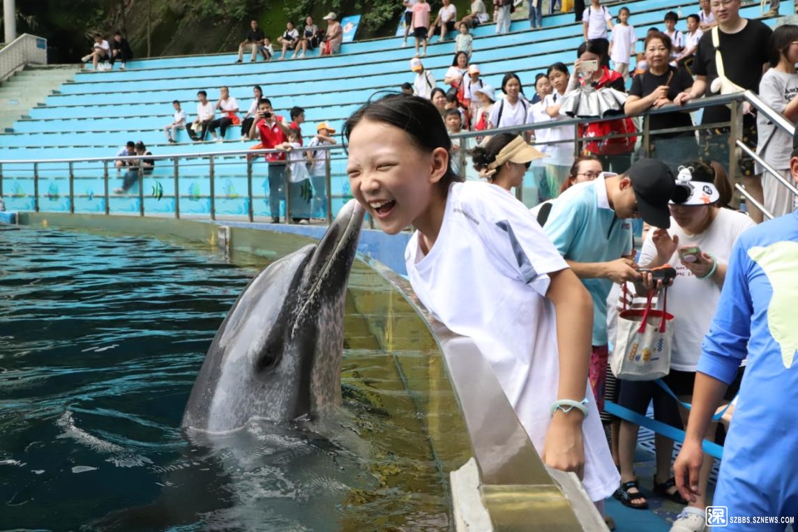 正午的餐厅飘着勾人的饭菜香,孩子们的小肚子很快被美食填满,连额角的汗珠都带着饭菜香。午后最期待的海洋剧场里,湛蓝水池突然掀起丈高浪花 —— 海豚们踩着音乐的节拍登场了!它们像银色闪电般跃出水面,弧线优美得如同被精心描画,落下时溅起的水花星星点点洒在孩子们脸上,凉丝丝的舒服极了。当 11 岁的语婕被选中与海豚亲密互动,海豚用光滑的额头轻轻蹭她的脸颊,冰凉滑腻的触感让她瞬间睁圆了眼睛,睫毛簌簌发抖。她蹦跳着:“海豚亲我啦!这脸今天不洗了,要带着这份温柔回家!”