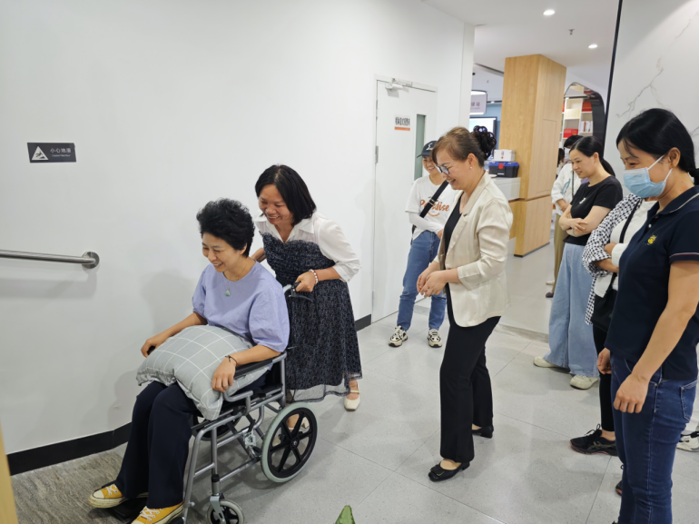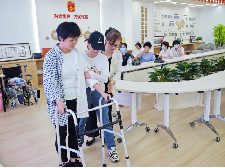 随后,居民们积极参与分组练习。冯女士在练习协助老人使用助行器行走时,一开始有些手忙脚乱,助行器总是不听使唤。讲师见状,立刻上前手把手指导:“别着急,你要先调整好助行器的高度,让老人能够舒适地握住把手。然后,站在老人身后,用双手轻轻扶住老人的腋下,跟着老人的步伐移动。”在讲师的耐心指导下,冯女士逐渐掌握了技巧,顺利地帮助 “老人”走了几步,脸上露出了开心的笑容。大家遇到疑问及时向讲师请教,现场学习氛围浓厚,时不时传来交流讨论的声音。