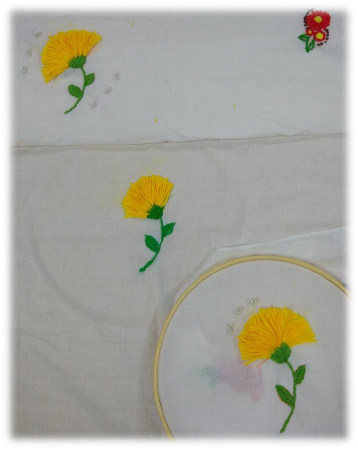 同学们掌握得很好!不一会功夫,一朵朵黄的、粉的波斯菊就展现在手帕上。